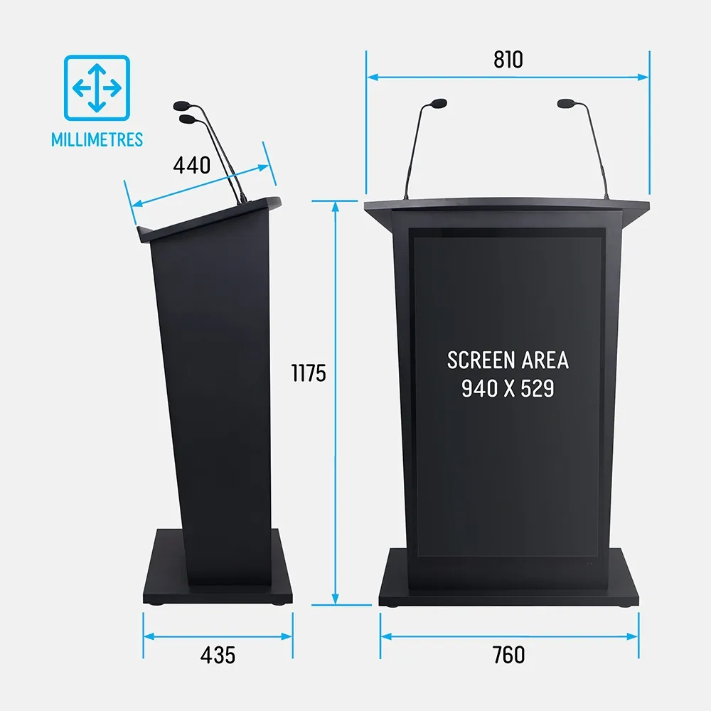 This podium is made from steel with a black finish, combining a sleek look with durability of the 49kg unit. Self-leveling feet help keep the unit steady on uneven flooring and protect surfaces from damage. Rear ventilation holes ensures airflow to the screen to prevent overheating during long sessions, with the commercial grade signage rated for 18 hour a day, 7 days a week usage. Access to the screen ports and outputs on the rear of the display are easily accessible for full set-up. Order online from Slimline Warehouse today for fast Australia-wide shipping and upgrade your event setup with an all-in-one digital podium solution.