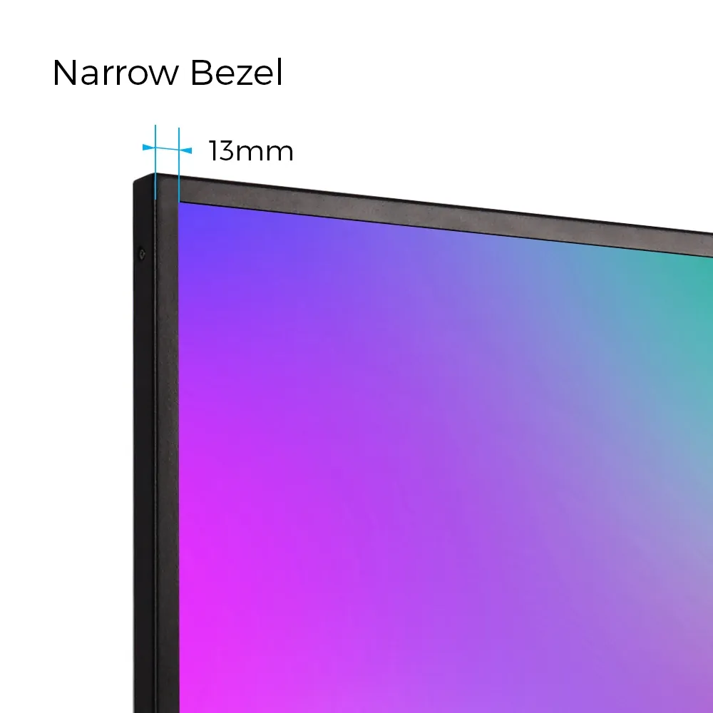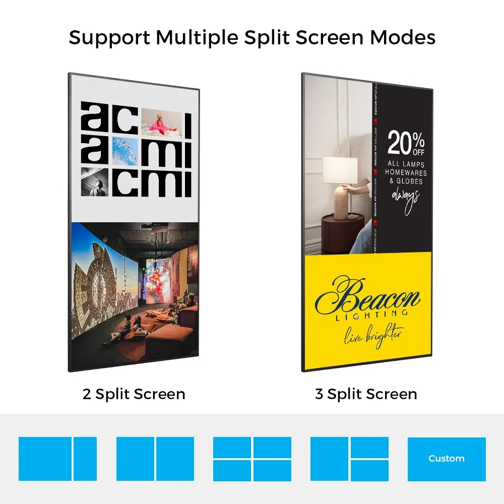 - Slim bezel digital commercial displays support portrait or landscape screen orientation