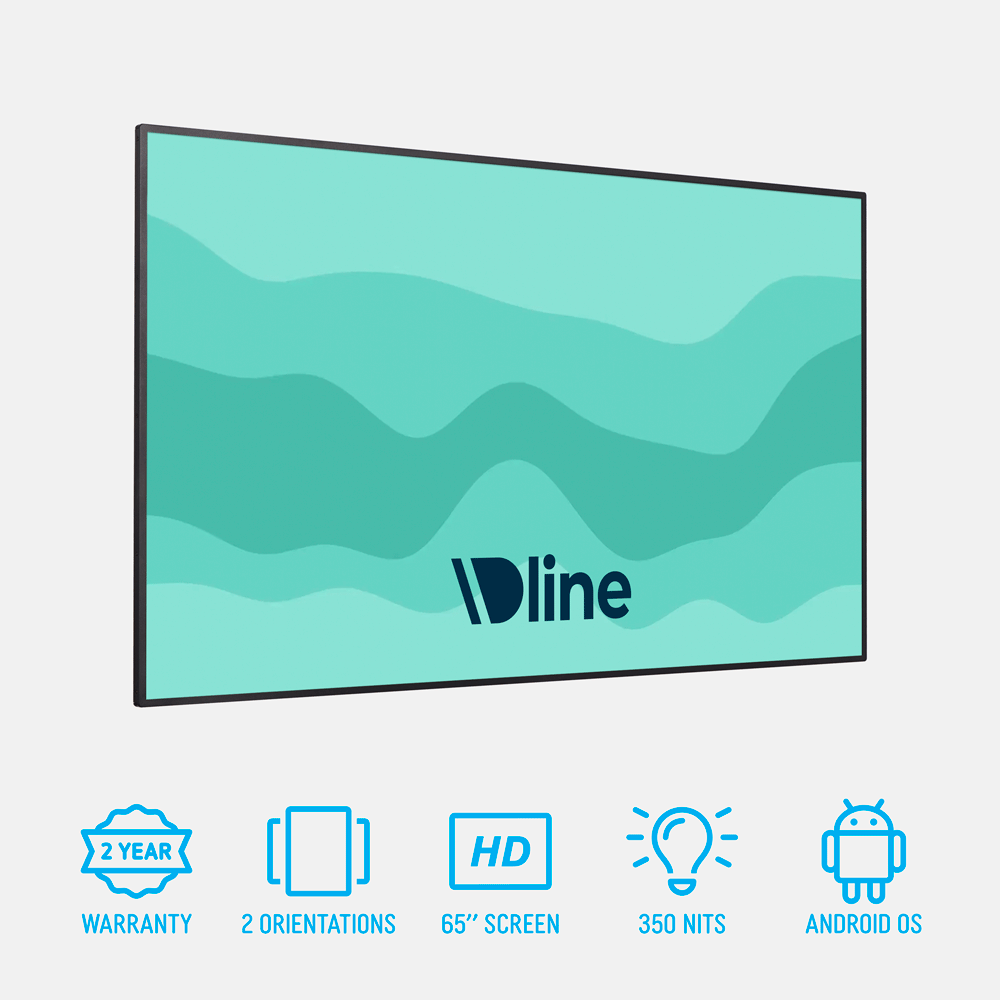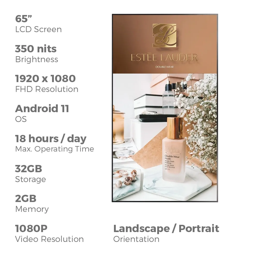 - 65” screen has 1080 x 1920 full HD resolution for crisp promotional content