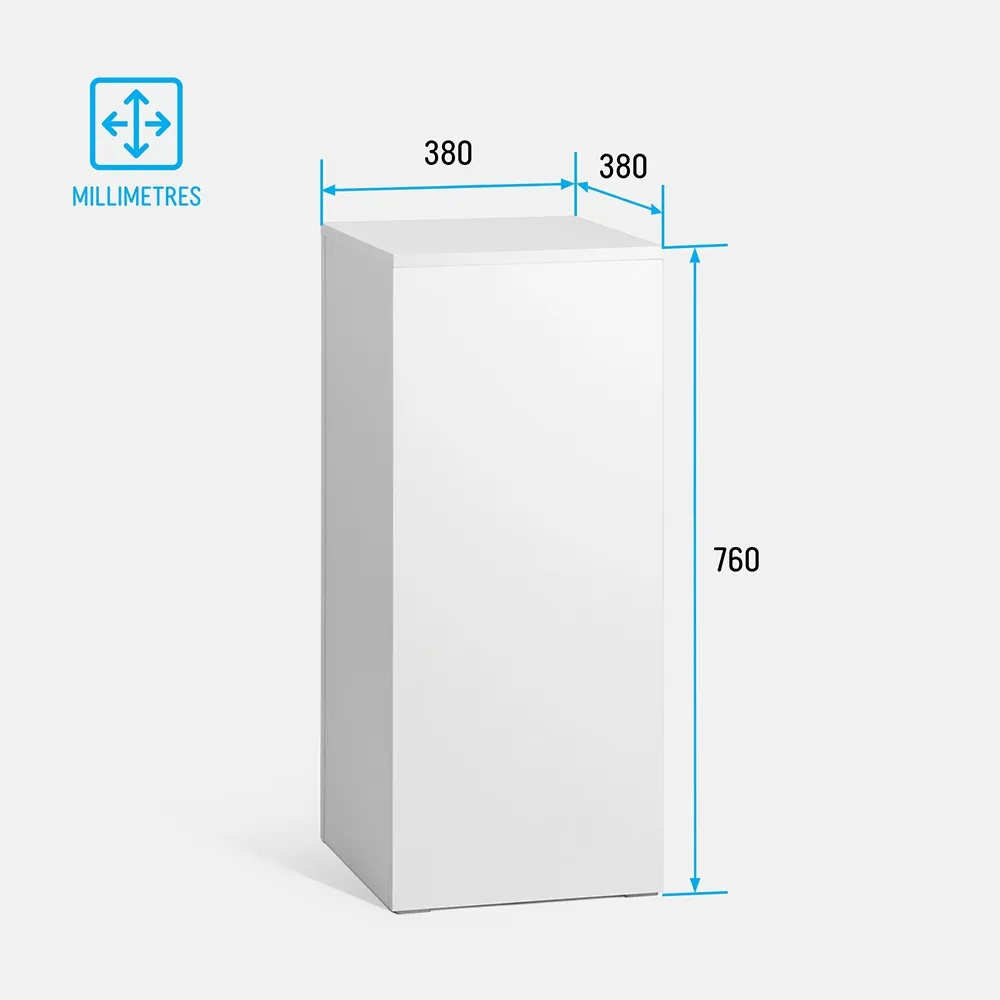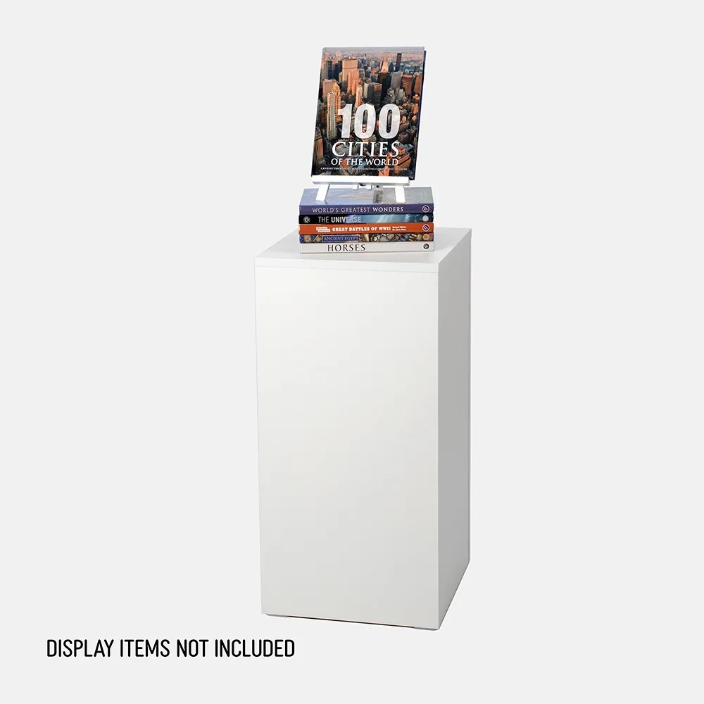 - White display pedestal is 76cm tall display with a 38 x 38cm top display area