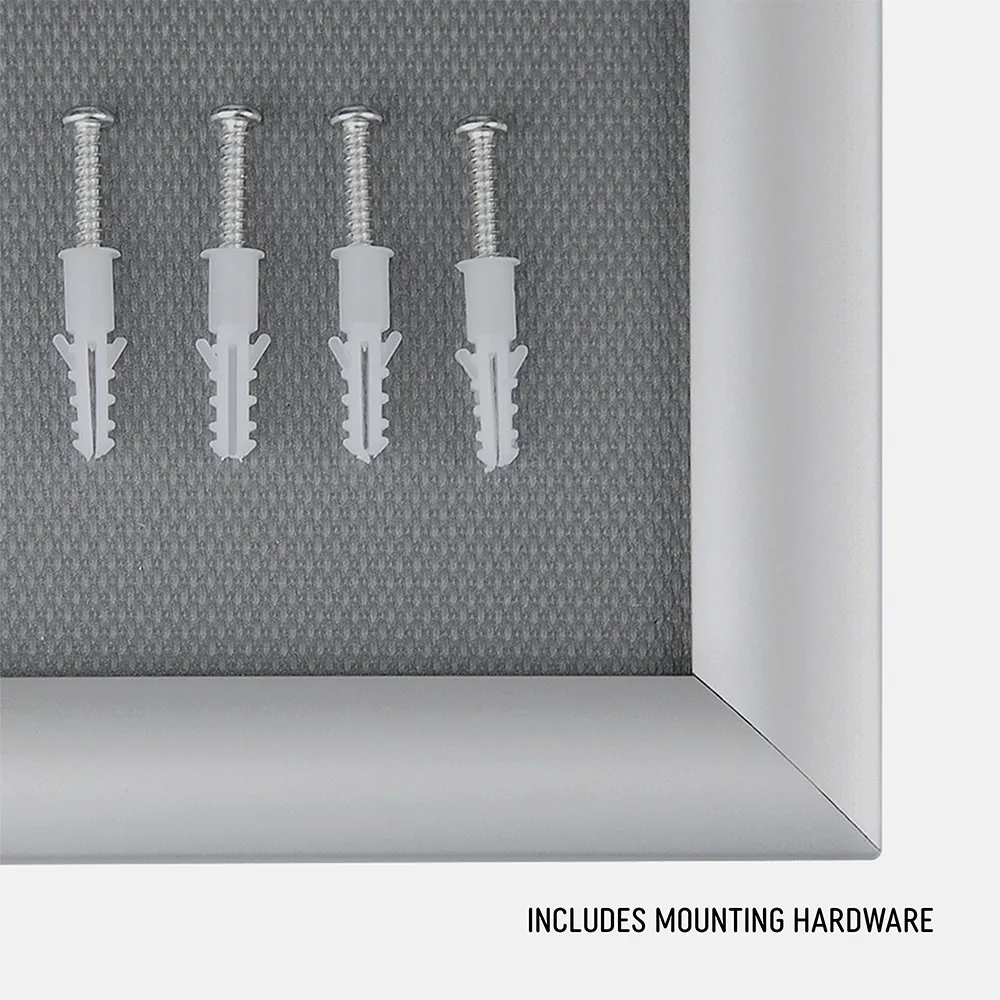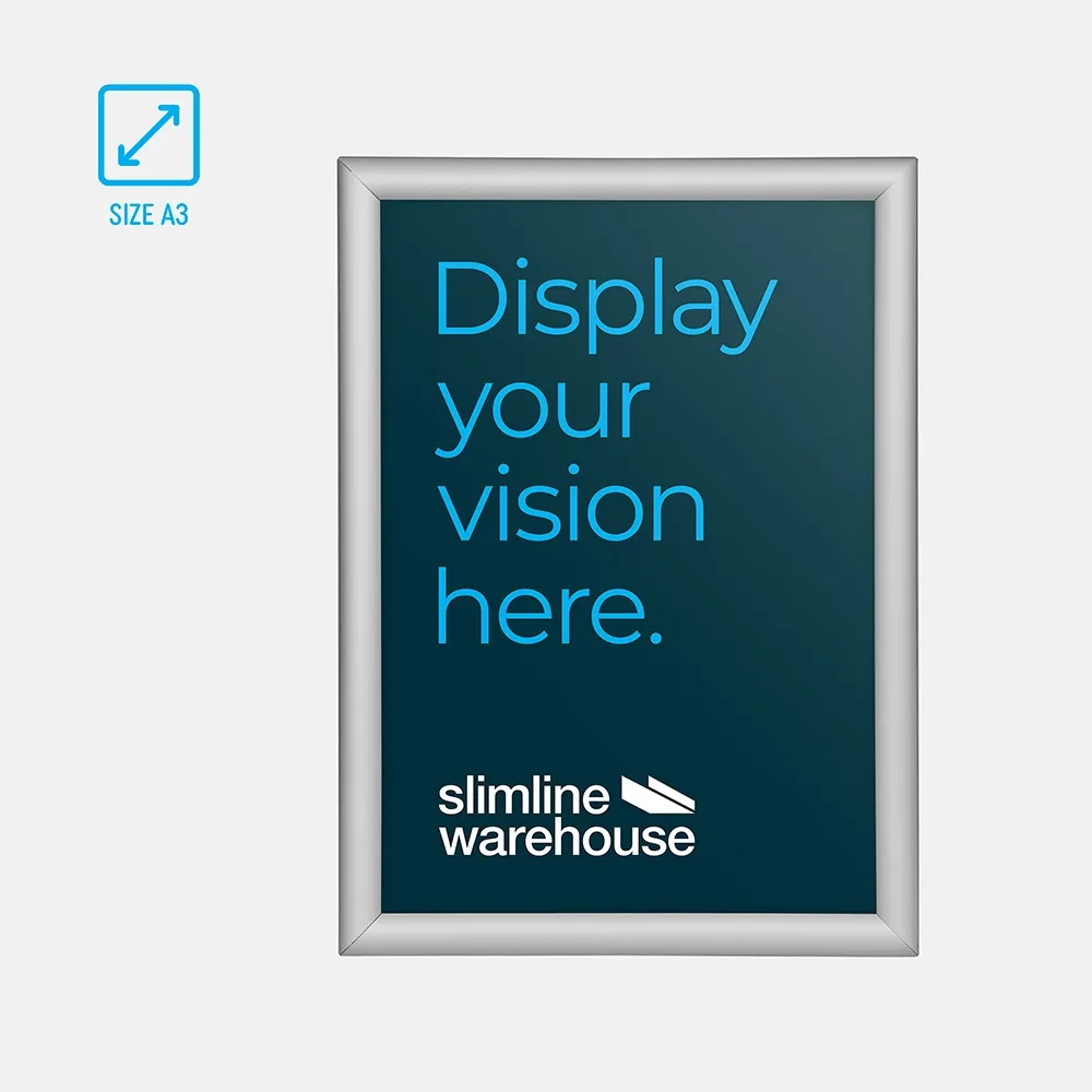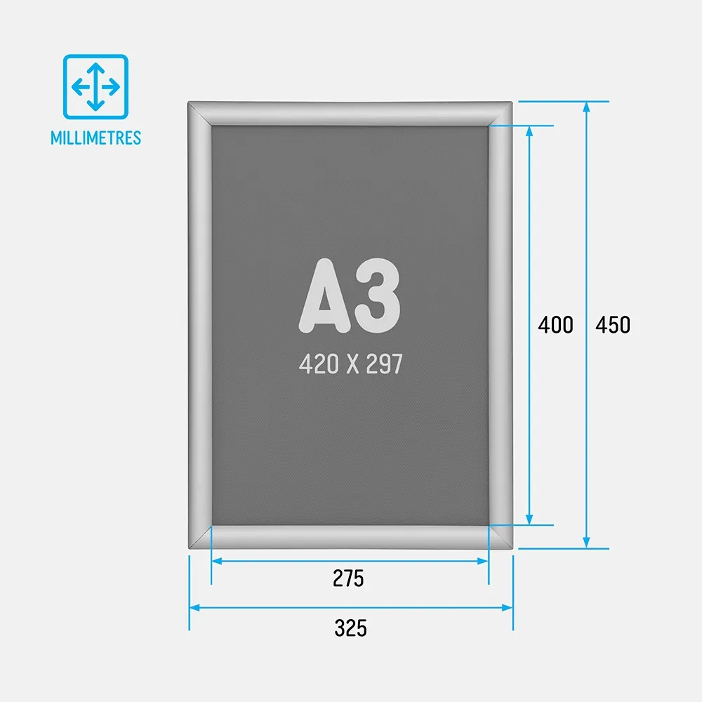 These clip frames or sign frames can be used for places such as shopping malls, exhibitions or banks. Constructed using extruded aluminium, the frame is finished in matte silver to compliment your in-store graphics. Mounting hardware is also included with the A3 snap frame; the frame itself has been prepared with mounting holes for your convenience. The uses for these clip frames are endless and they can be easily updated as they are constructed with a snap frame.