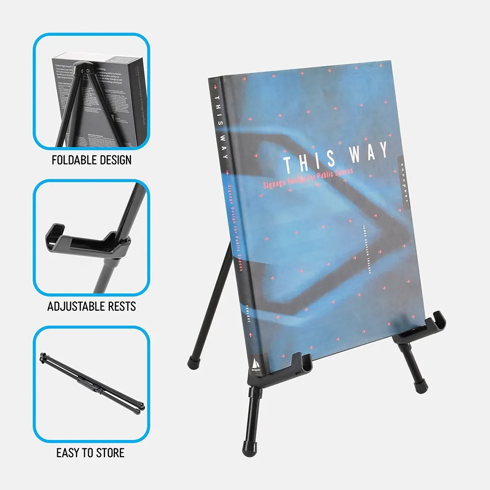 Countertop easels are made from tubular metal with a black finish, offering a sleek display that blends in well with any surrounding. Each leg is independently movable for changing the height and angle items are displayed at. These legs also feature a rubber cap that helps with traction as well as preventing scratches on tables or desks.