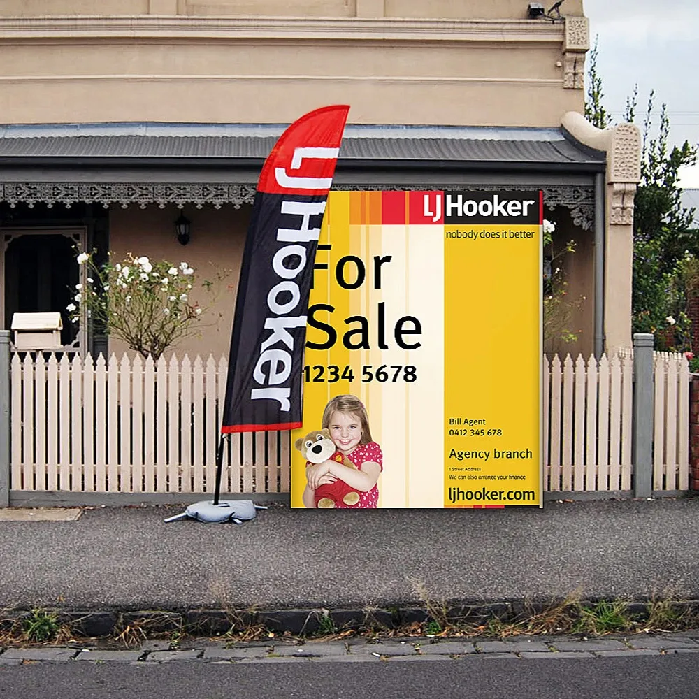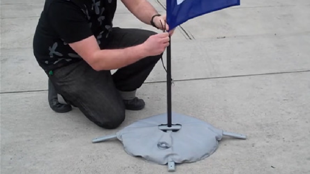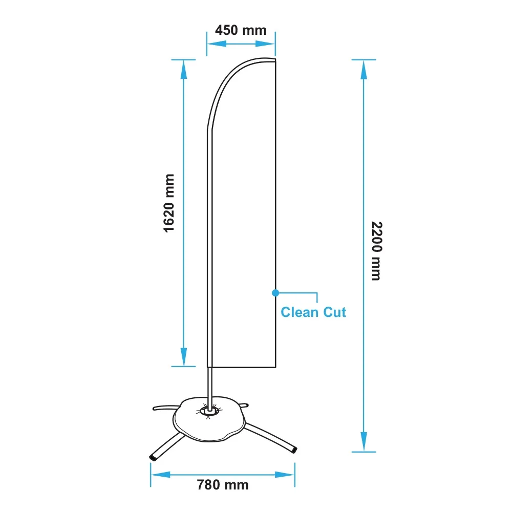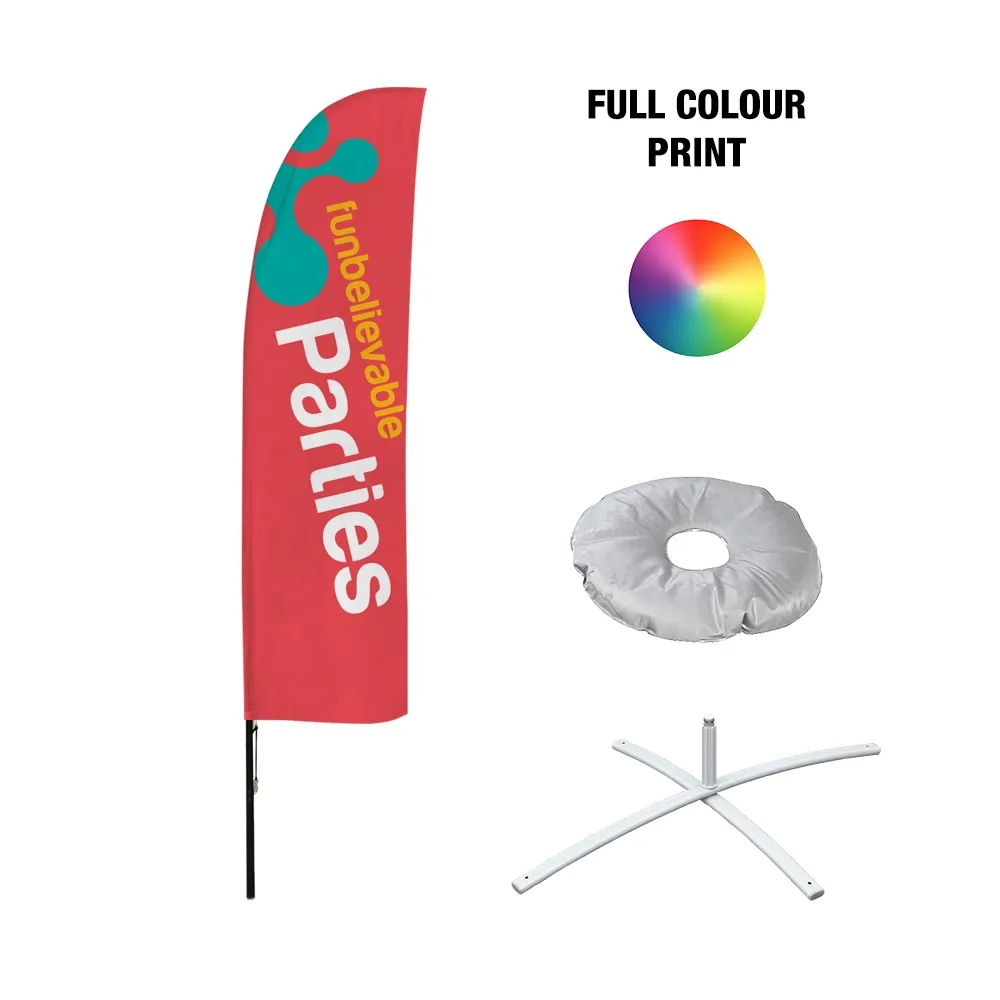 Marketing flags feature a cross base that can be placed on different surfaces for display both indoors and outdoors. A water bag is provided as well, helping to stabilise the stand when used during different weather conditions and keeping the display upright. These promotional banners also make assembly quick and easy, without any tools necessary to quickly set-up the stand. Depending on the type of your print you choose, you'll receive a metal pole (dual-sided) or fibreglass (single-sided).