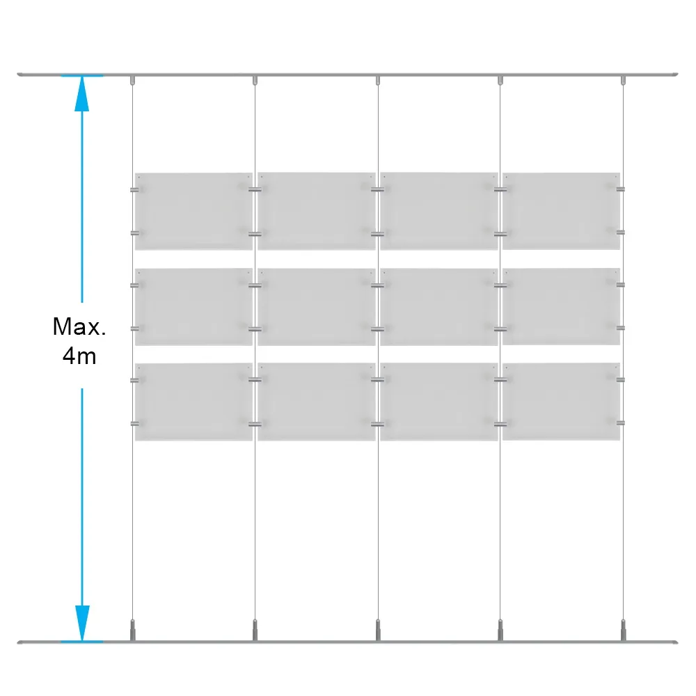 The picture hanging rails, like hanging poster signs, use edge grip standoffs and joiners to attach the frames to the cables to create the floating effect. There are (4) 1m long aluminium rails included that go along the floor and ceiling and make it easy to slide the wire fittings into proper position. There are (5) total cables included that are all 4m long, providing plenty of length to be cut to size to work with most spans in a minimum 2000 x 660mm area.