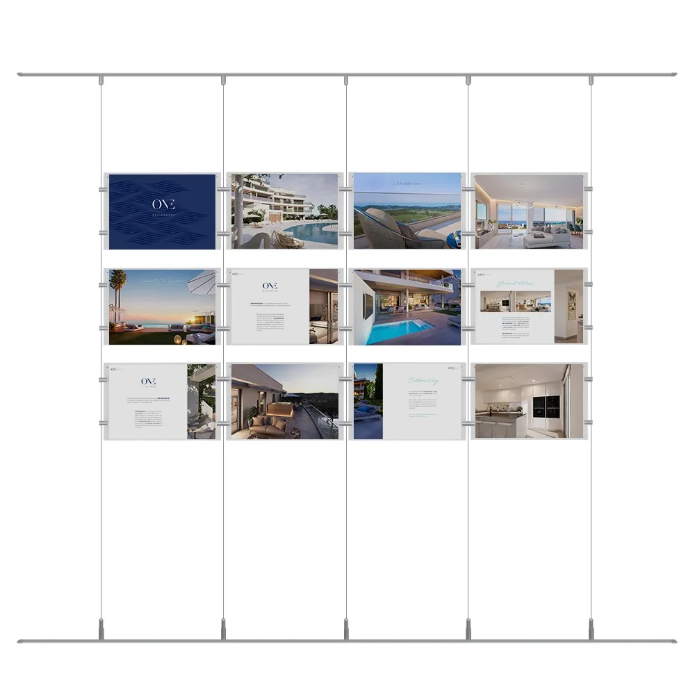 Picture hanging rails combine steel wires with clear acrylic frames for eye-catching poster displays that are used in real estate agencies, retail stores, shopping centres, information centres, museums, and more! The poster holders made from 3mm thick clear acrylic with polished edges, offering a full view of posters in an eye-catching frame. There are (12) poster frames included that are all dual-sided to display a total of (24) graphics at once, ideal for use in storefront windows to reach passersby inside and outside the business at once. The holders display A4 (210 x 297mm) posters in landscape orientation and have a slide-in design to make switching out posters simple with no tools necessary. Small button magnets embedded within each side panel help keep frames shut and prevent the sides from opening up during display.