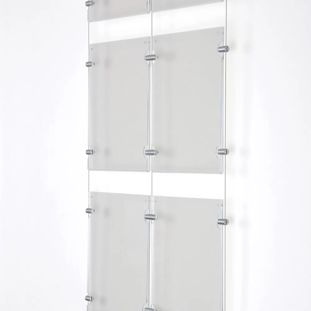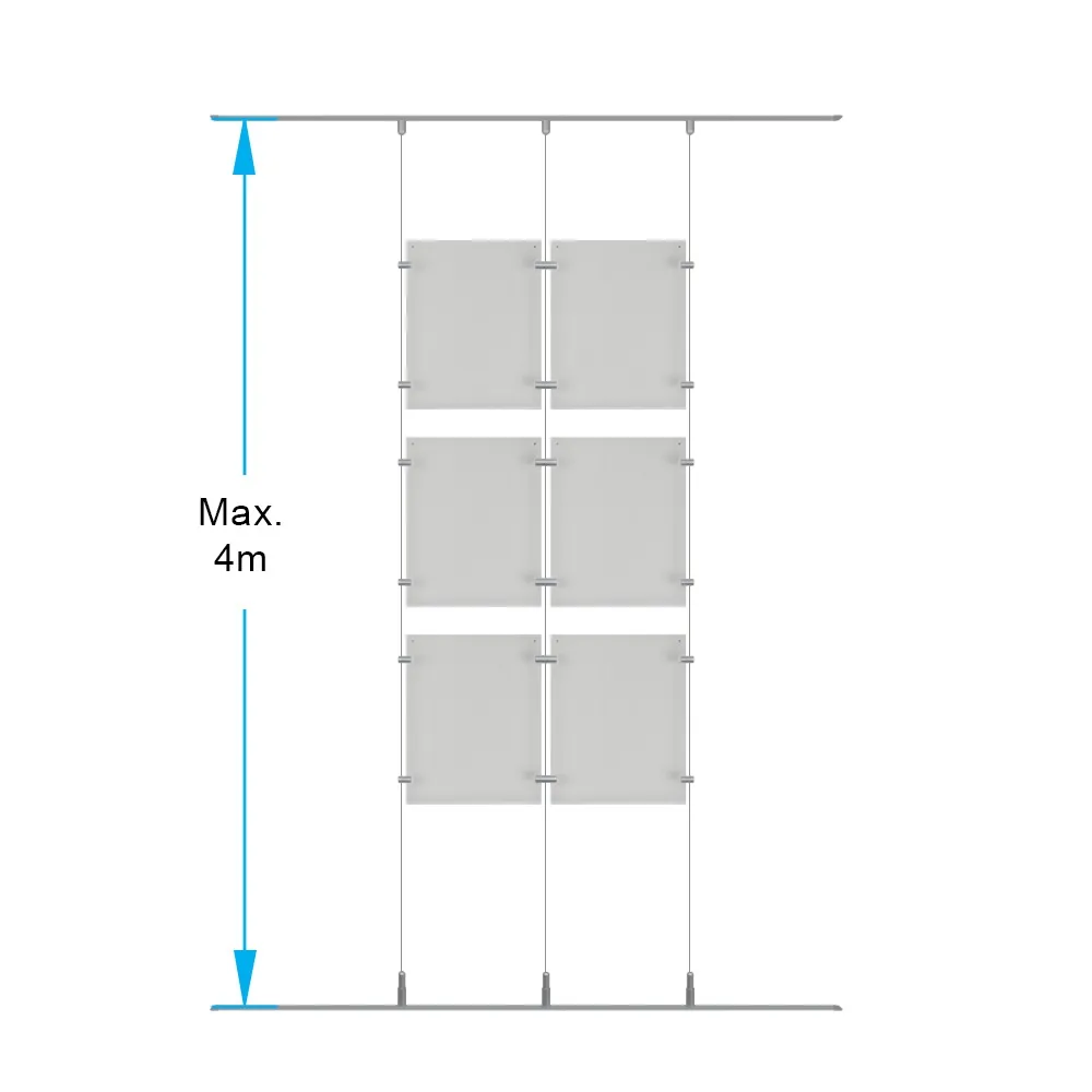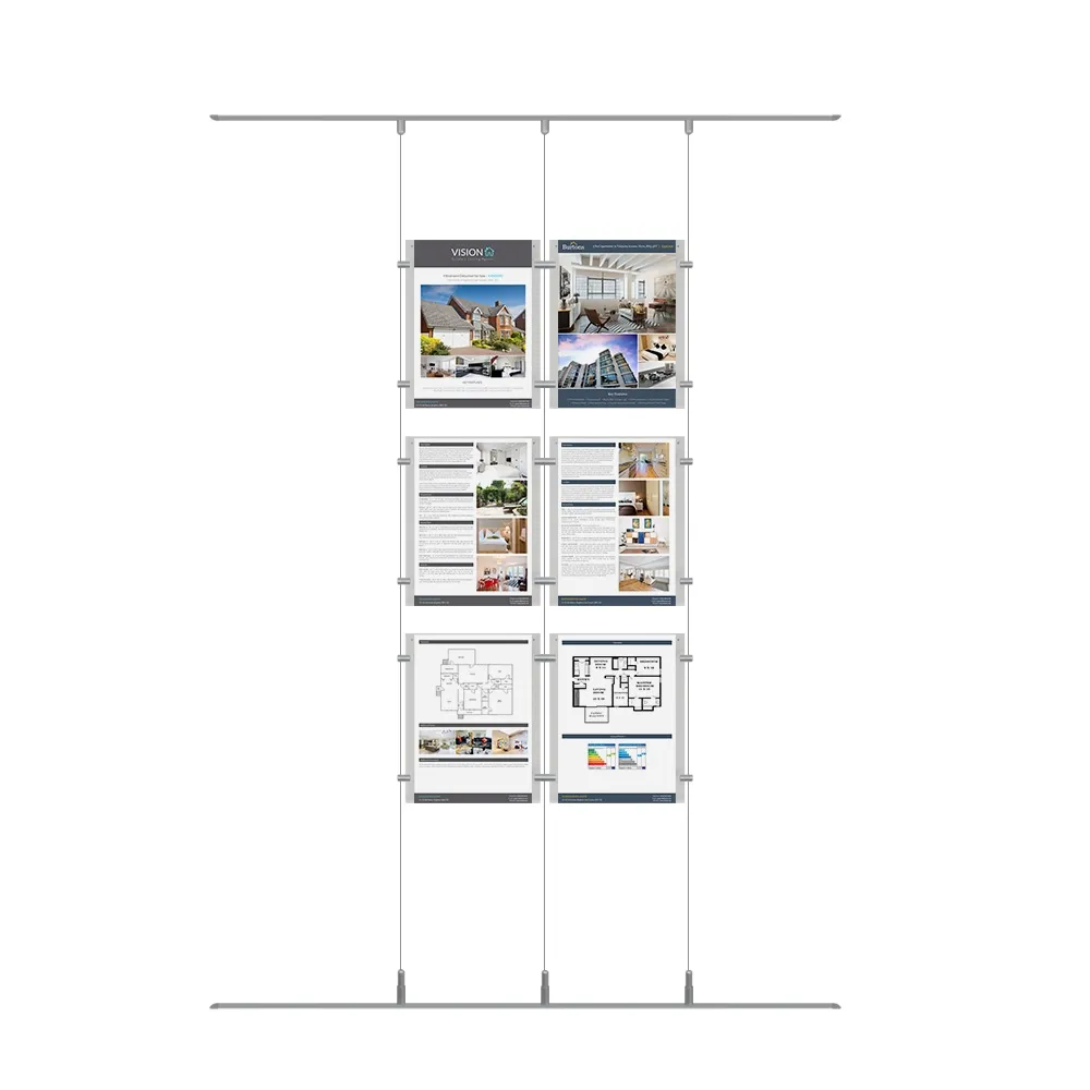 The hanging rail system, like real estate window displays, suspends the frames between the floor and ceiling using wires and standoffs that connect to rails with fittings that slide into place instead of having to individually install each one. There are (3) 4m long cables provided that can be to cut to size to fit the span of most locations without an issue. Standoffs and joiners use an edge grip to secure the frames to the wires and each other to create the floating effect for the 3 x 2 array. Order by 3pm EST for same day shipping to anywhere in Australia with this and most other in stock products from Slimline Warehouse!
