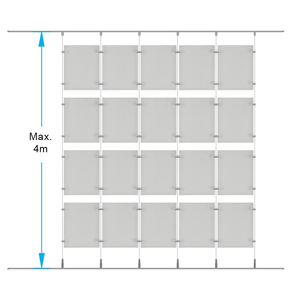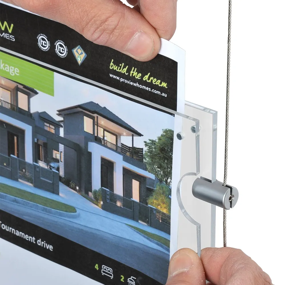 The wire display system, like hanging poster signs, includes (4) 1m long aluminium rails that go along the floor and ceiling to make sliding fittings for the cables into place easy, no need to individually install each one! There are (6) 4m long cables included with this kit that can be cut to size to fit most floor to ceiling spans, with a minimum area of 1280 x 1245mm required to fit the entire 4 x 5 array. The standoffs and joiners are made from stainless steel and feature an edge grip that attaches the frames to each other and the wires securely. Order by 3pm AEST to receive same day shipping with this and most other in stock products to anywhere in Australia, only from Slimline Warehouse!