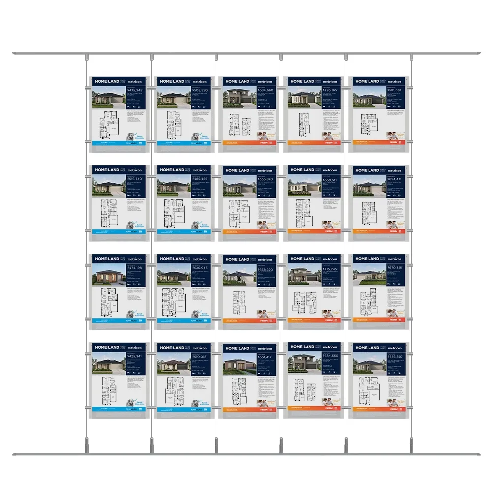 This wire display system is used in real estate agencies, retail stores, museums, art galleries, and more to display a wide grouping of posters in a single array! There are (20) individual poster frames in this kit that are each dual-sided to display a total of (40) posters at once! The 2-sided design makes this display perfect for use in storefront windows where passersby both inside and outside of the location can be advertised to. Each frame is made from 3mm thick clear acrylic with polished edge and is designed to hold A4 (210 x 297mm) posters that are in portrait orientation. Small button magnets are embedded in each side panel to keep the frame shut and prevent posters from moving out of position during use.