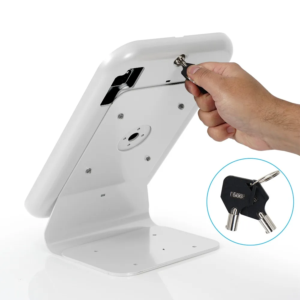This iPad tablet mount is a locking display to provide a safe way to have a tablet ready for use at your location. There are dual locks on the unit that help to deter thieves and keep the unit safe while on display in public spaces. The provided key set allows employees to gain access to the device in order to make any changes necessary. The home button on the unit is covered to disallow users from accessing full device settings and making changes. There are vents next to the locks to help promote airflow to prevent overheating as well as allow audio to be heard if utilising sound.