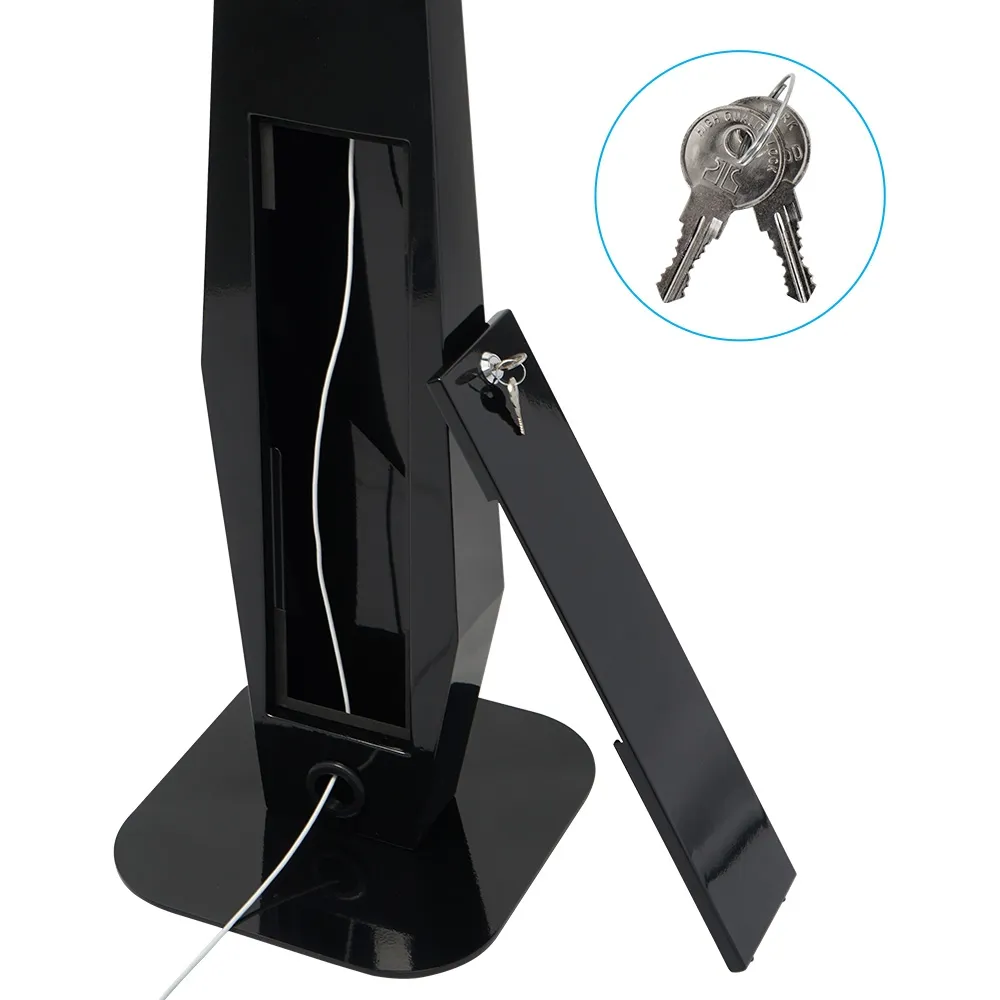 This floor standing tablet holder, like other security iPads stands, uses a lockable design for safe use in public spaces to deter would-be thieves. Additionally, there is a Kensington lock slot on the mount if you wish to have the entire display securely attached to the structure of your business. The 1200mm tall mount makes it easy for all to use, with a slanted front face for an ergonomic design. A small interior cabinet is accessible via a rear door to provide storage space in a locking area. The stand also features internal cable band management to keep power cords hidden within the unit whilst maintaining a tidy appearance.