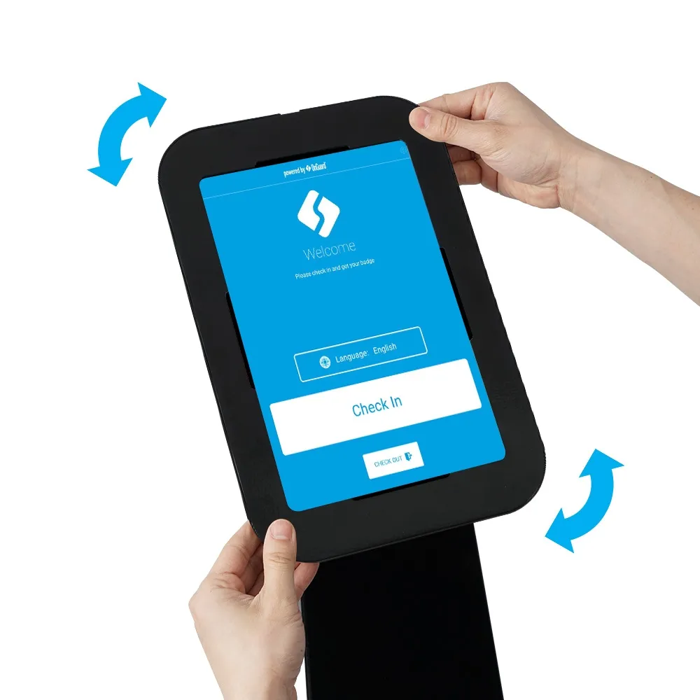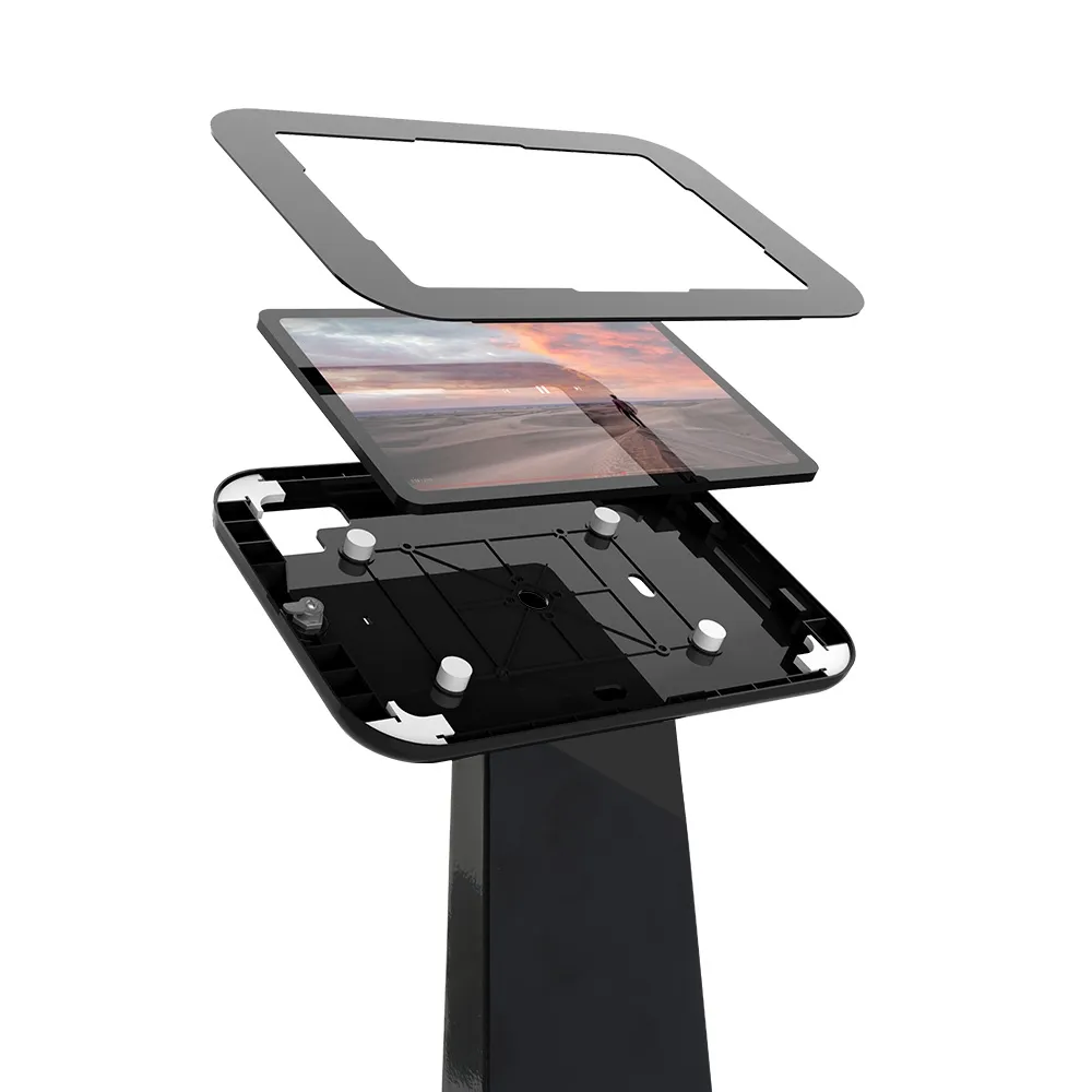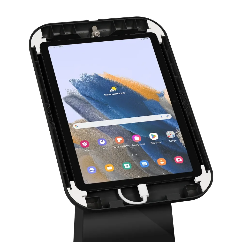 This floor standing tablet holder makes it easy to have a device or customers or visitors to use anywhere at your location. This stand features a versatile mount that can display your device in either landscape or portrait format in order to keep your App in the right orientation. The bracket is designed to hold many non-iPad devices, including Samsung Galaxy Tab A7 10.4” & A8 10.5”, Samsung Galaxy Tab S9 FE 10.9”, Samsung Galaxy Tab A9+, S7, S8, & S9 11”, Lenovo M10 (3rd gen) 10.1”, Lenovo M10 Plus (3rd gen) 10.61”, Lenovo Tab M11 10.95”, and Microsoft Surface Go (2, 3, & 4th gen) 10.5” models. No matter which device you use, the camera is exposed to allow for both facial ID and additional interactions.