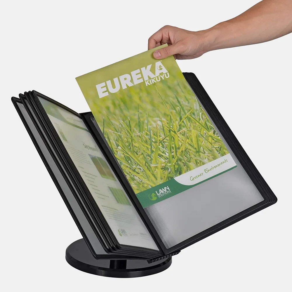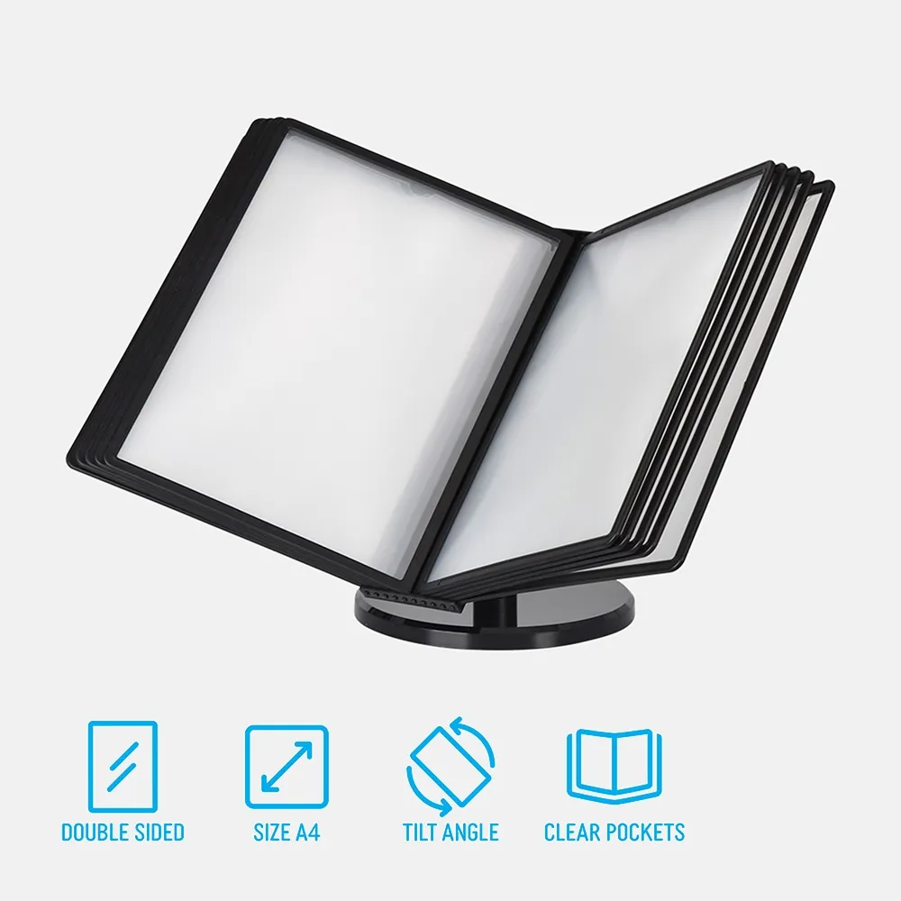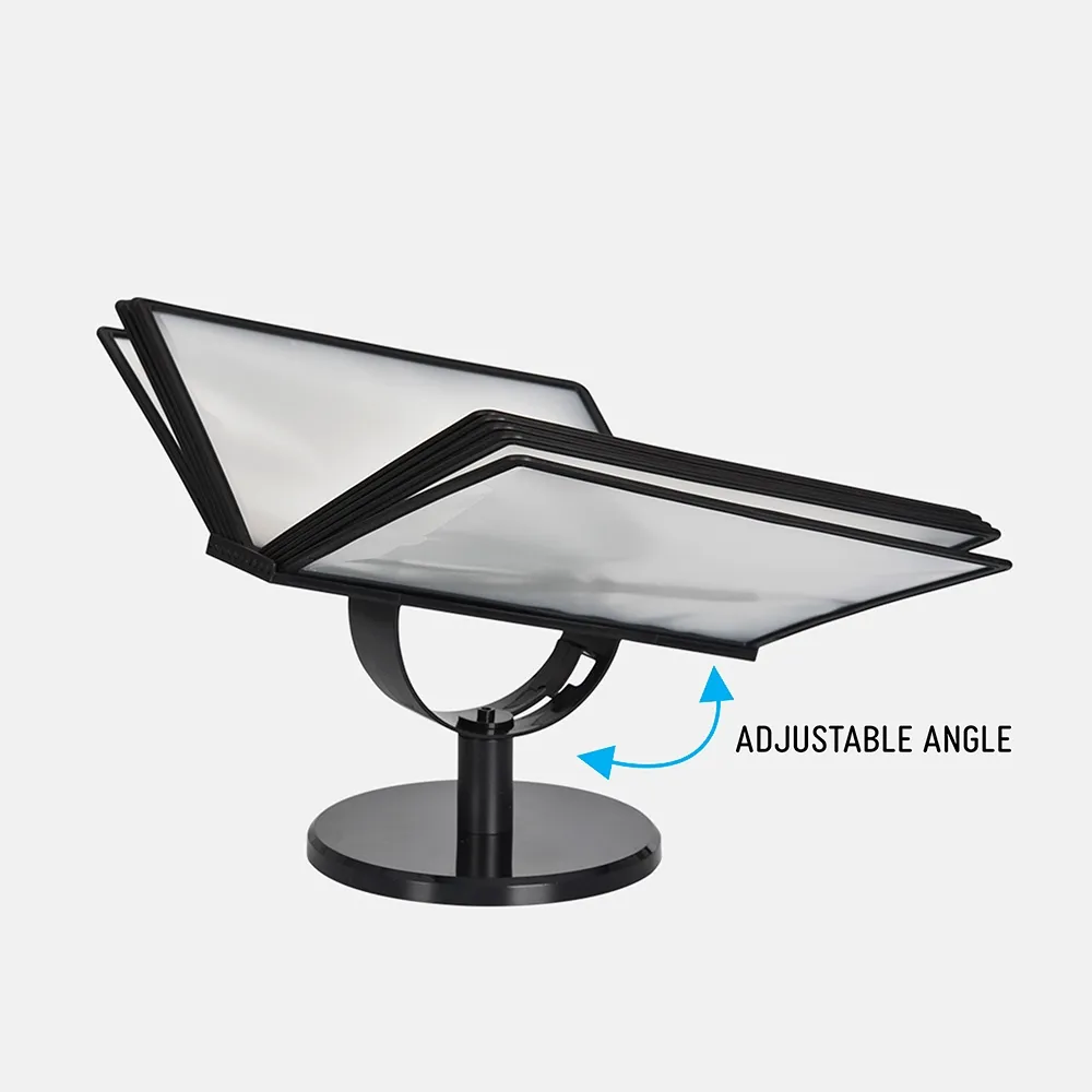 We call this display an information centre because it can be used: to organise and quickly reference office documents; as a menu presentation folder; or to display printed catalogues and brochures. The display stand features an adjustable angle to suit your desk or counter height and swivels on the base for added flexibility of presentation