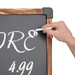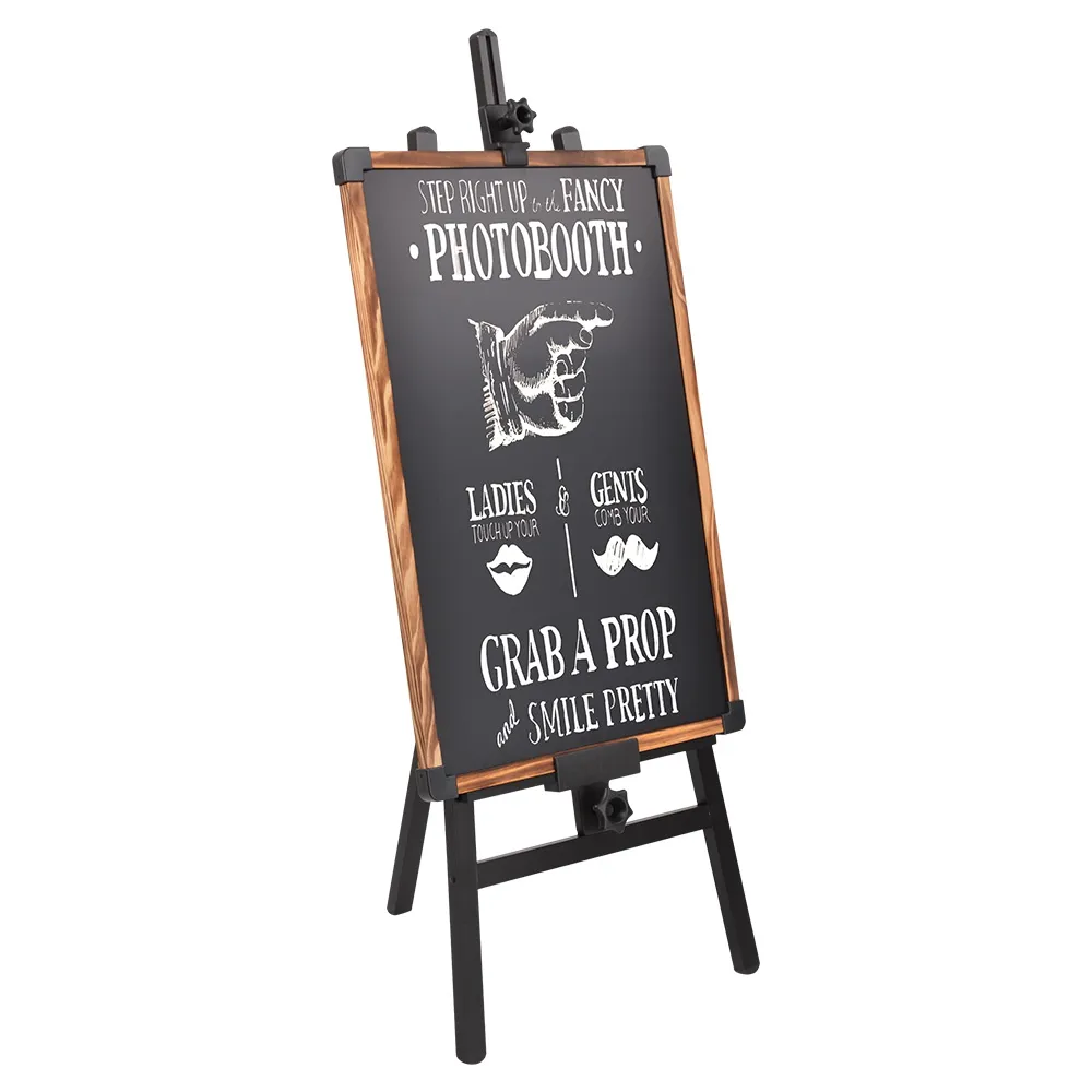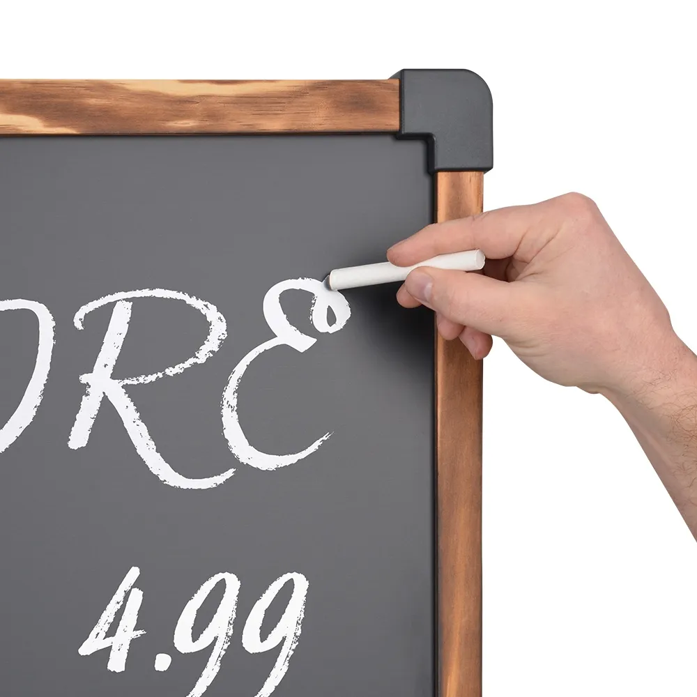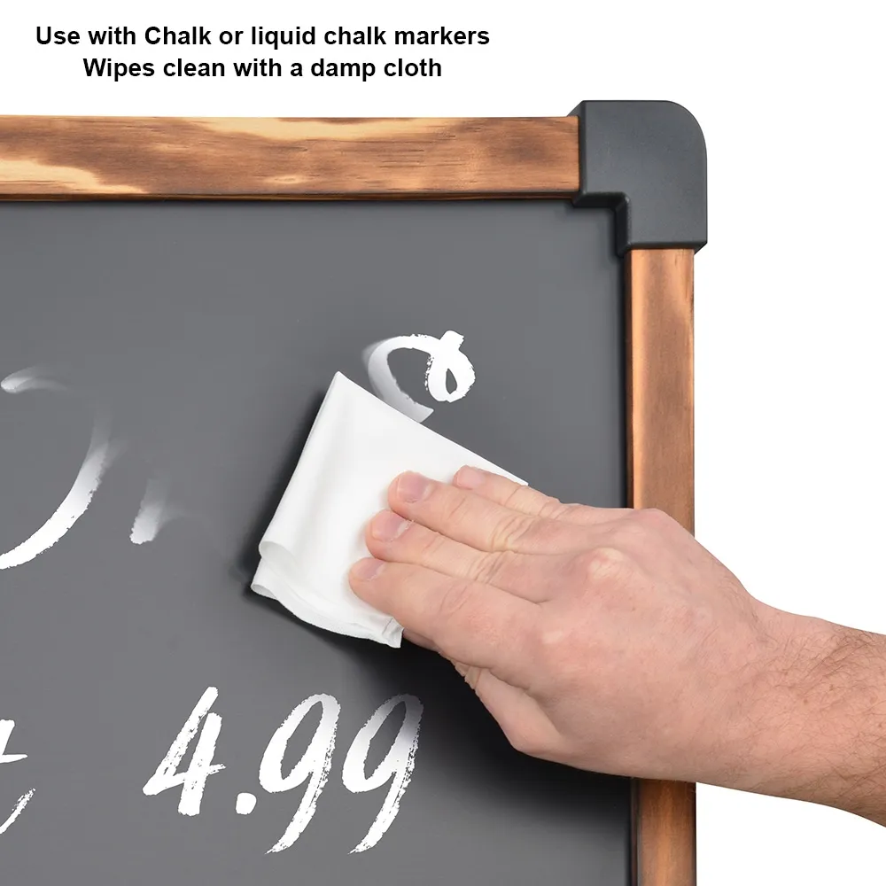 This menu board with stand, blackboard easel promotes sale specials, upcoming events, and more in a highly visible fashion! The 600 x 900mm markerboard lets you or your employees inscribe messages to help turn visitors into customers, with chalk or bright fluorescent markers creating an eye-catching display easier to see for passersby. The frame has a beautiful smoked timber finish, adding a stylish look that complements the included tripod stand and works well with the décor of any location, including cafes, retail stores, restaurants, shopping centres, and more.