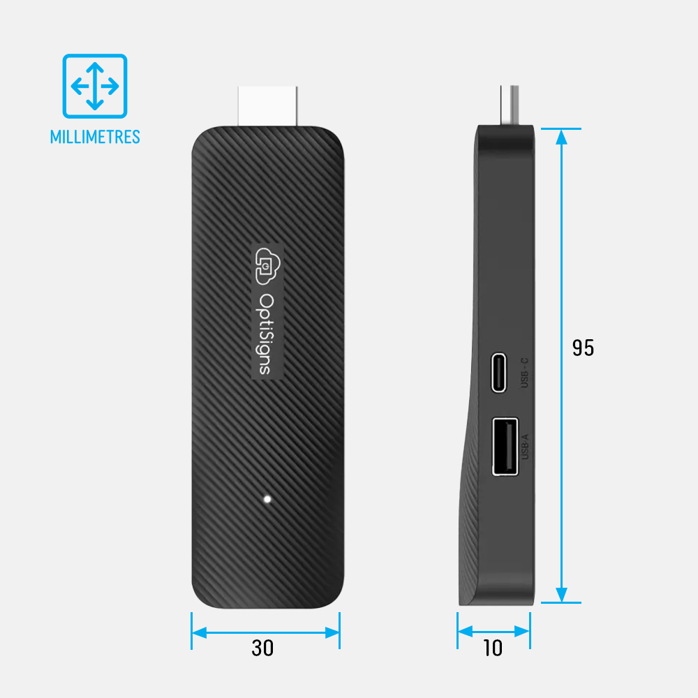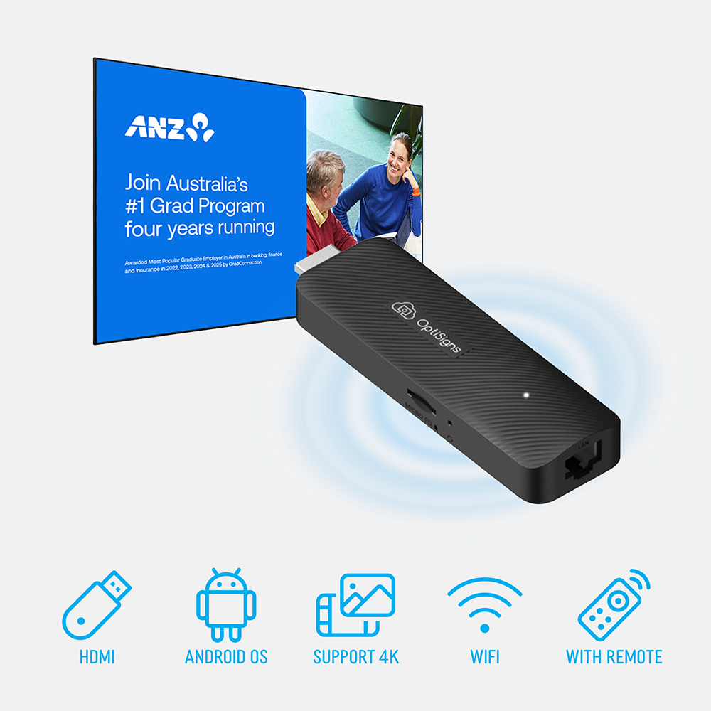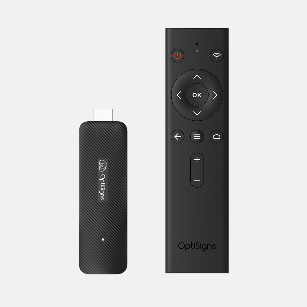 Expertly designed, our OptiStick digital signage player delivers stunning 4K content, supports multiple split-screen zones, and is fully compatible with all OptiSigns software features and apps.