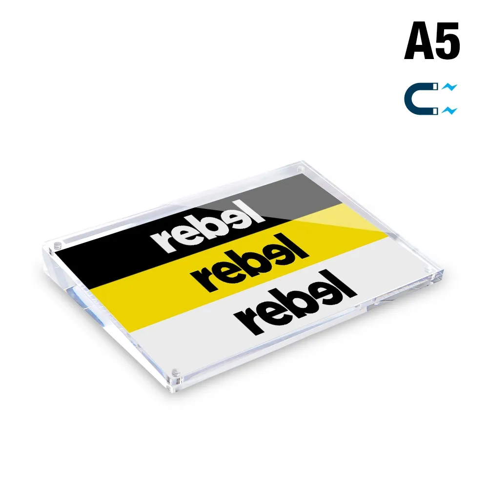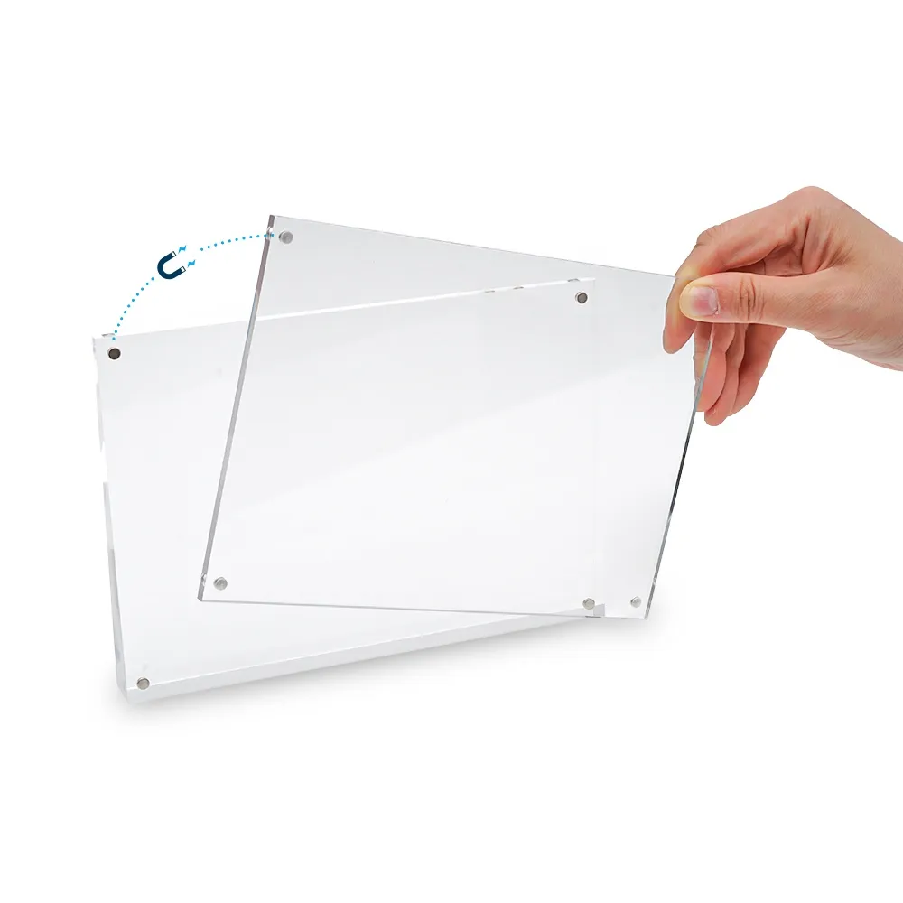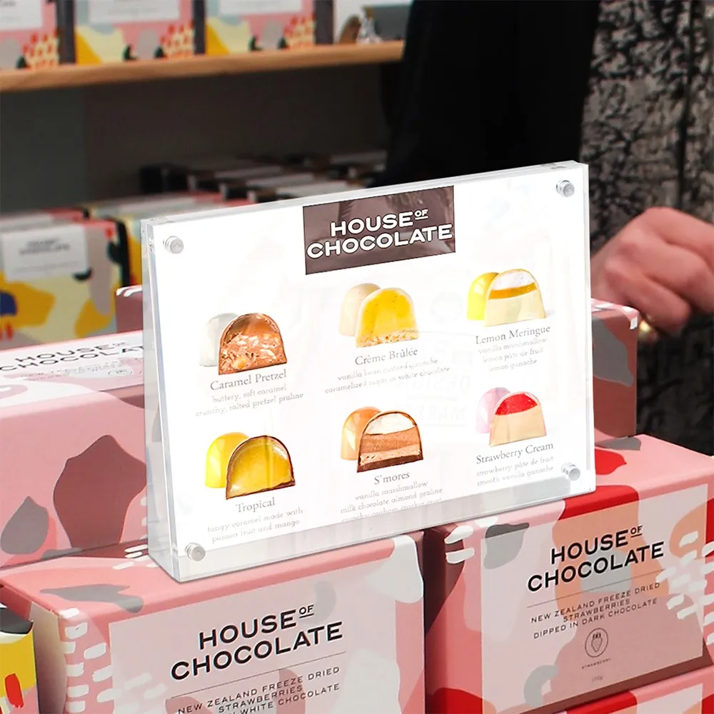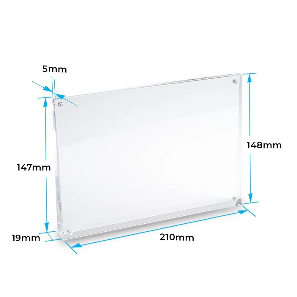 The acrylic block sign, like similar perspex signage holders, uses strong embedded magnets to secure the clear front panel to the solid base. These magnets ensure that graphics stay aligned and in place while still making it easy to swap out signage when needed without tools. Its angled body improves visibility when the sign is laid flat and also elevates your message when standing upright, catching the eye of passing customers. This display is commonly used in restaurants, reception desks, retail stores, trade show booths, and cafes.
