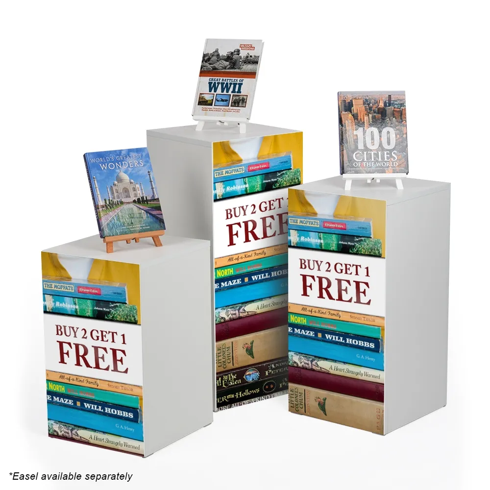 - White laminate display pedestal has PVC printed poster for easy promotions!