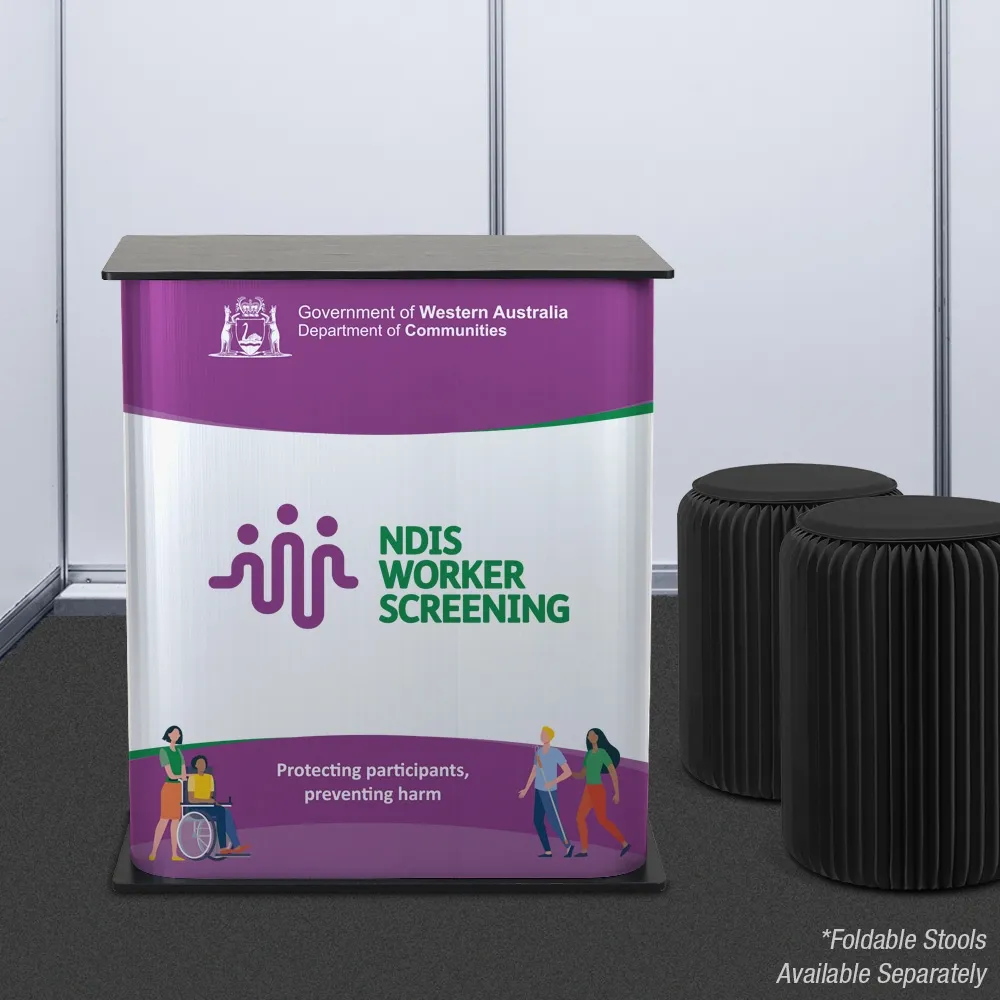 - Trade show booth counter features custom printed wrap to brand display!