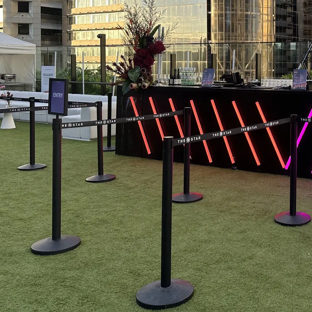 The stanchions are sold with custom printing in one colour on both sides of the belt, allowing you to put your company logo on the barricade for passersby to see. The retractable belt barrier is quickly assembled in minutes without any tools needed. The base is rubberised to protect the floor from scratches and weighted to keep it in place. The end of the retractable belt has a tamper-proof clip to keep the barricade in place once set-up!