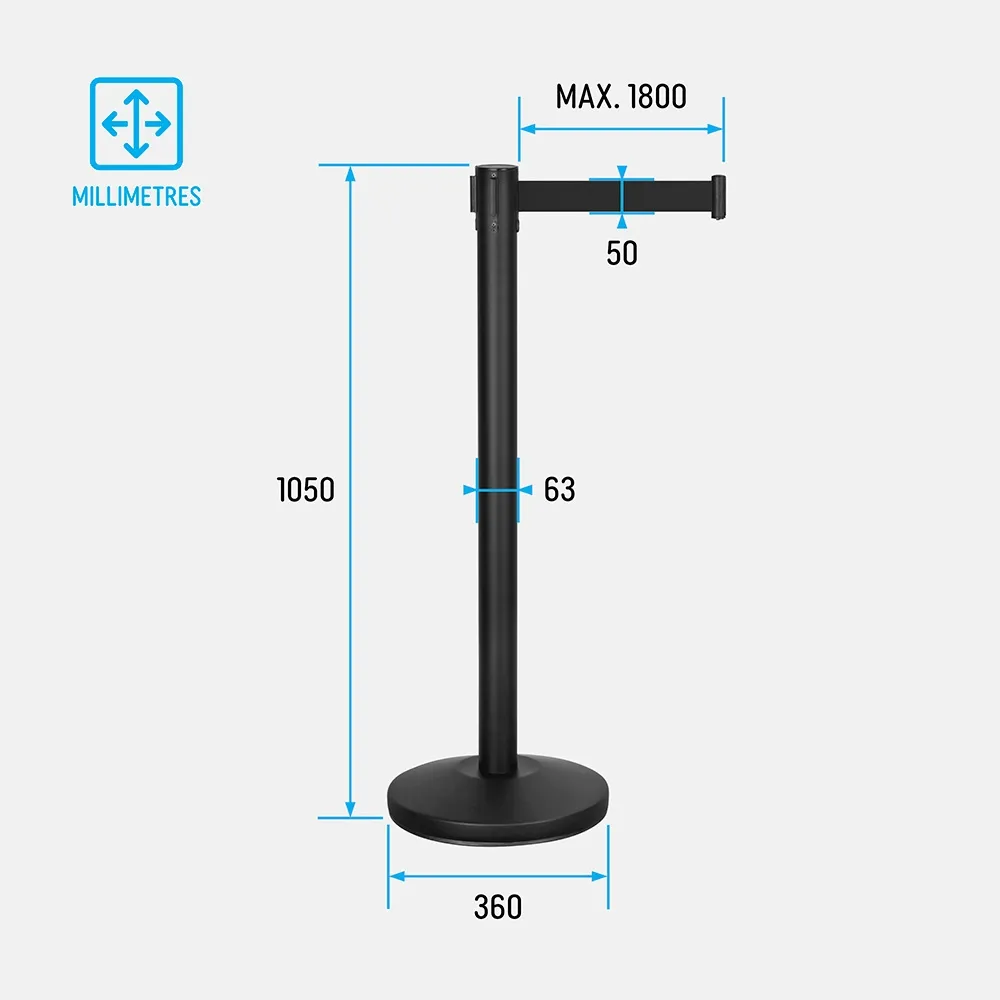 - Retractable barrier posts include 1 post at 1.05 metres and 1 retractable belt at 1.8 metres in length. We package the stanchions carefully to minimise the chances of damage during freight.