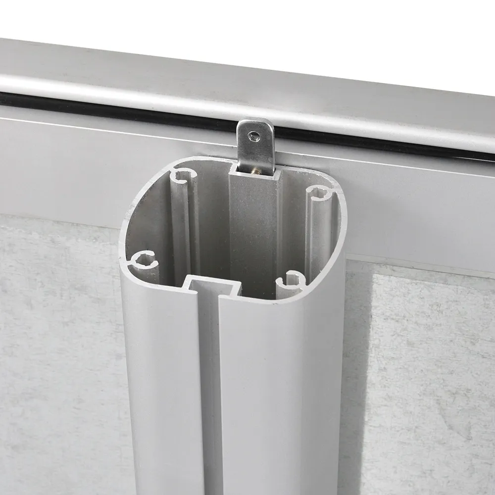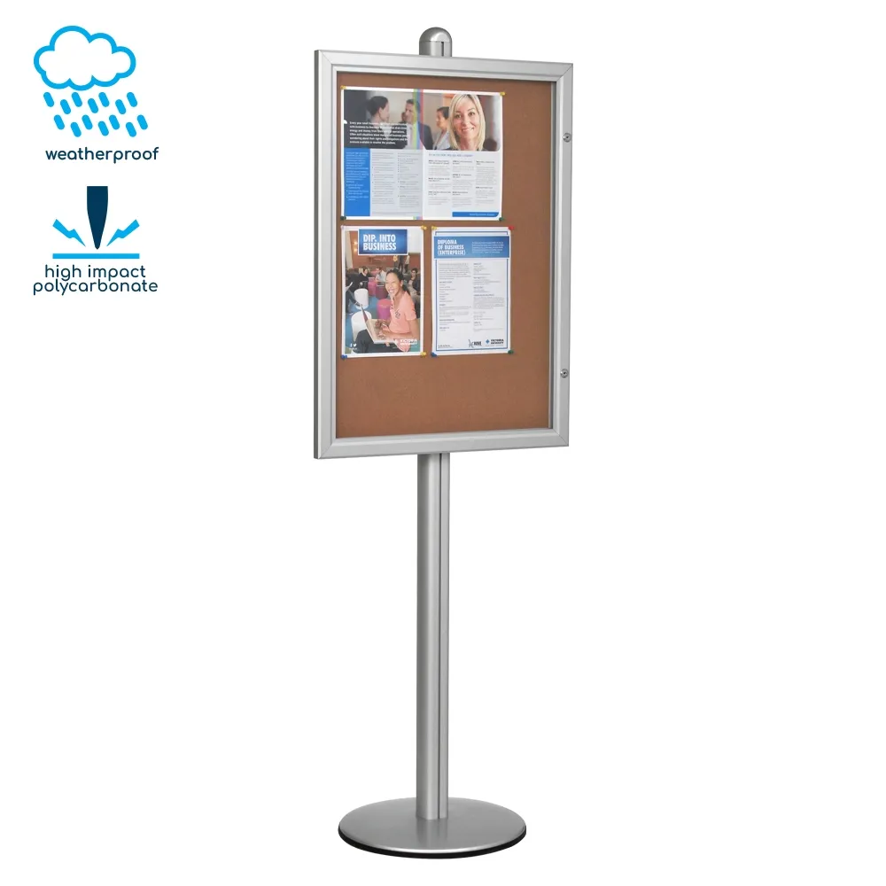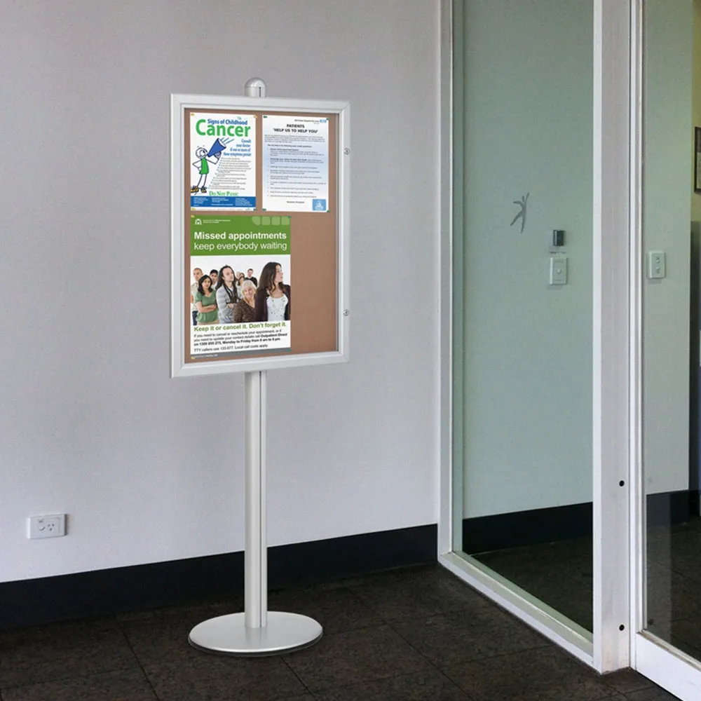 A self-healing corkboard is used to ensure a long-lasting unit that can have items posted using staples, push-pins, and tacks. The display itself is made from aluminium, providing a durable unit that is easily placed into heavily-trafficked locations. The satin silver finish matches any décor with ease, a professional looking display stand that helps to draw passersby attention.