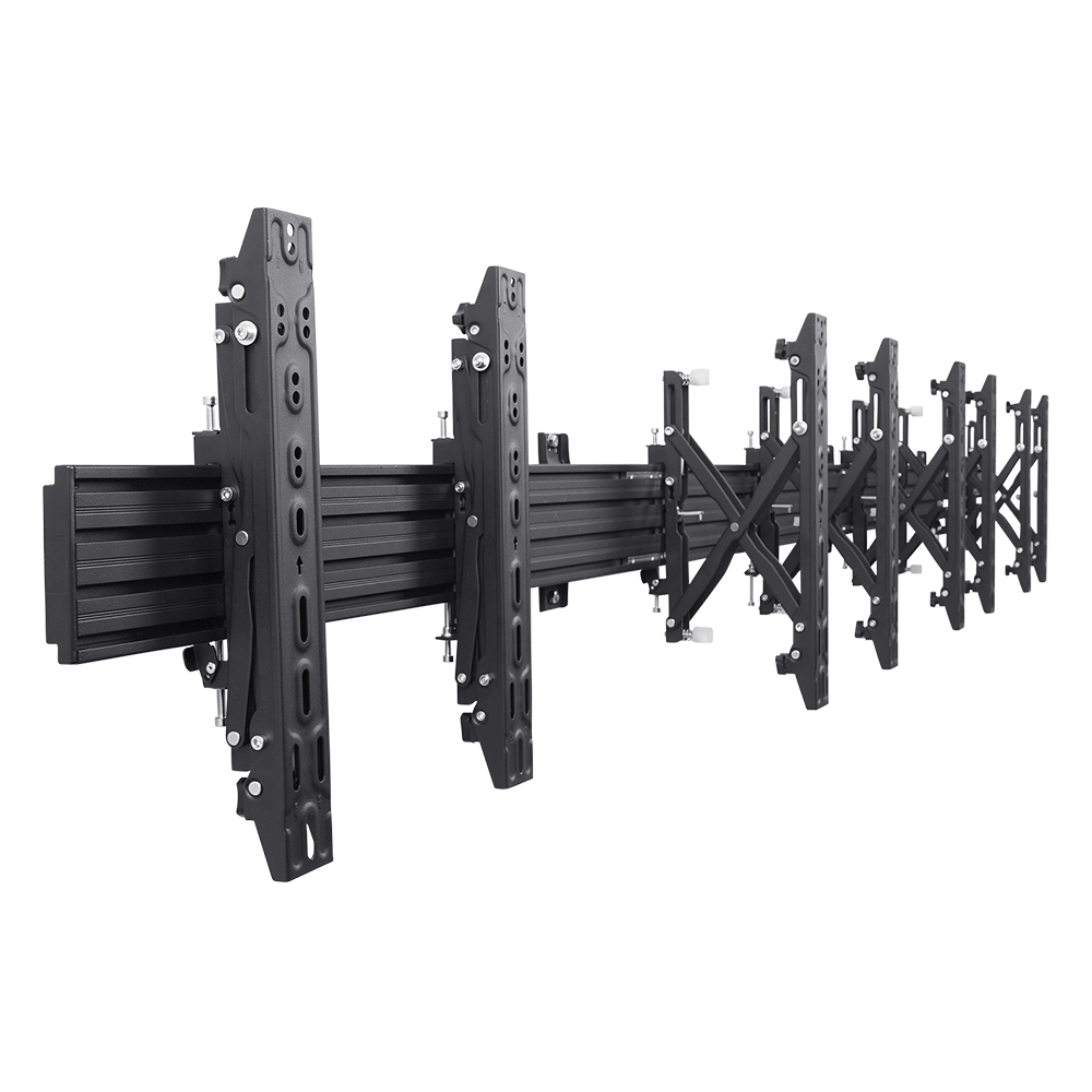The 4 screen wall mount, like a quad-display television bracket, utilises VESA compatible arms with 100 x 100mm to 400 x 400mm hole patterns that suit most flat panel televisions and monitors. Multiple brackets can be purchased and placed side by side to create video walls at casinos, hotels, retail stores, and more. The mounting arms can be shifted along the hanging rail to make positioning the screens where necessary simple. The mounted rail has a matte black finish to blend in seamlessly with any style of decor and keeps focus on the screens. Cable routing channels help reduce visual mess, making it easy to create a clean, professional display in any location.
