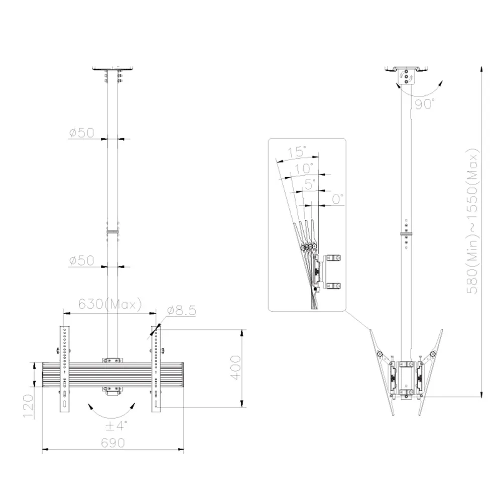 The TV brackets ceiling mount, a pole solution for flat panel installations, is particularly useful in locations where floor space is limited. Hanging screens from the ceiling enhances visibility and reduces floor clutter, removing tripping hazards and creating cleaner environments. The 1.5m pole height provides optimal elevation, with internal cable management that keeps the setup neat and professional. Perfect for use in hospitals, train stations, and retail stores, this display ensures that digital signage is visible and accessible from multiple directions.