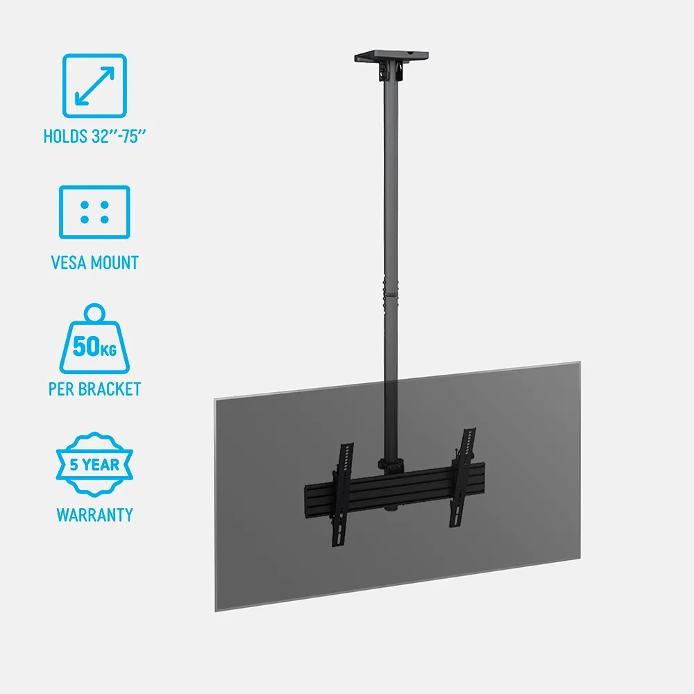 - TV ceiling bracket designed for 32”–75” flat panel displays up to 50kg