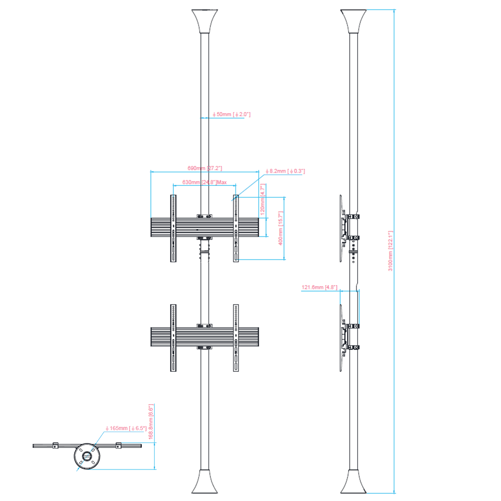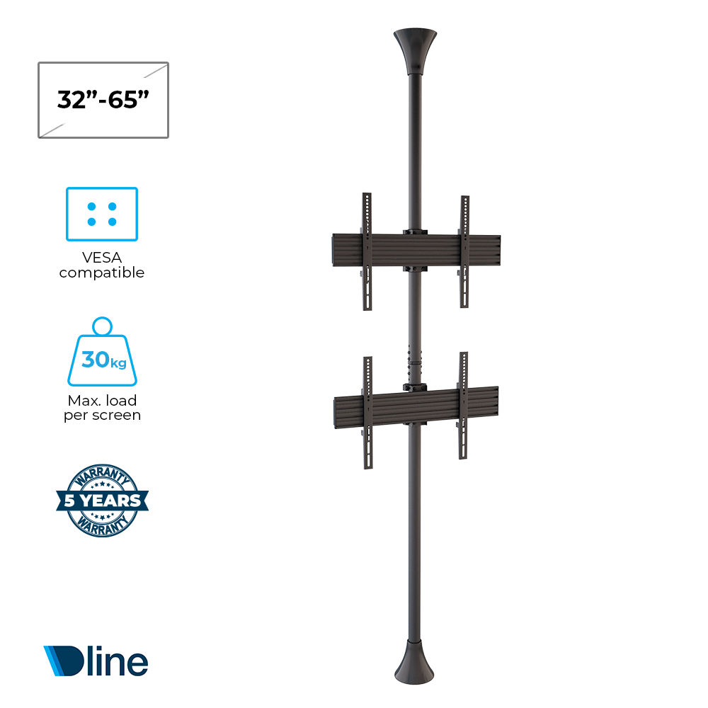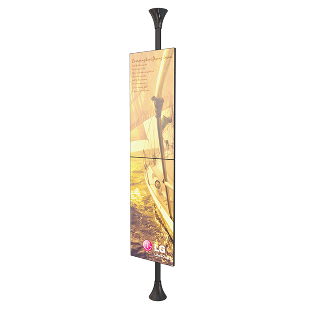 The TV brackets for ceiling mount, like hanging television displays, stack two screens vertically for maximum effect, ideal for exhibition halls or lobbies. Each bracket is VESA compatible for 100 x 100 - 600 x 400mm hole patterns for compatibility for huge range of makes and models. Whether used for wayfinding, art exhibitions, or advertising in retail, the bracket supports portrait or landscape screen orientation and is ideal for high-visibility environments. With dual mounting on one side of the pole, it provides excellent utility without crowding your space.