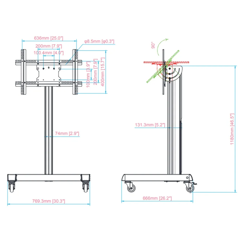The tilted TV stand, like a slanted screen stand for engagement zones, offers smooth rotation and tilt at 90° each way, making it perfect for adjusting to various viewing angles throughout the day. It supports both landscape and portrait orientations with VESA compatibility from 100 x 100mm to 600 x 400mm to suit nearly any make and model of flat panel screen. Whether you're managing interactive installations in museums, providing dynamic information at business receptions, or setting up a touchscreen wayfinder in a gallery, this tilt adjustable television kiosk adapts to your needs. A sleek black finish offers a modern look that matches any style of decor. At a height of 1180mm, it’s ideal for a range of interactions.