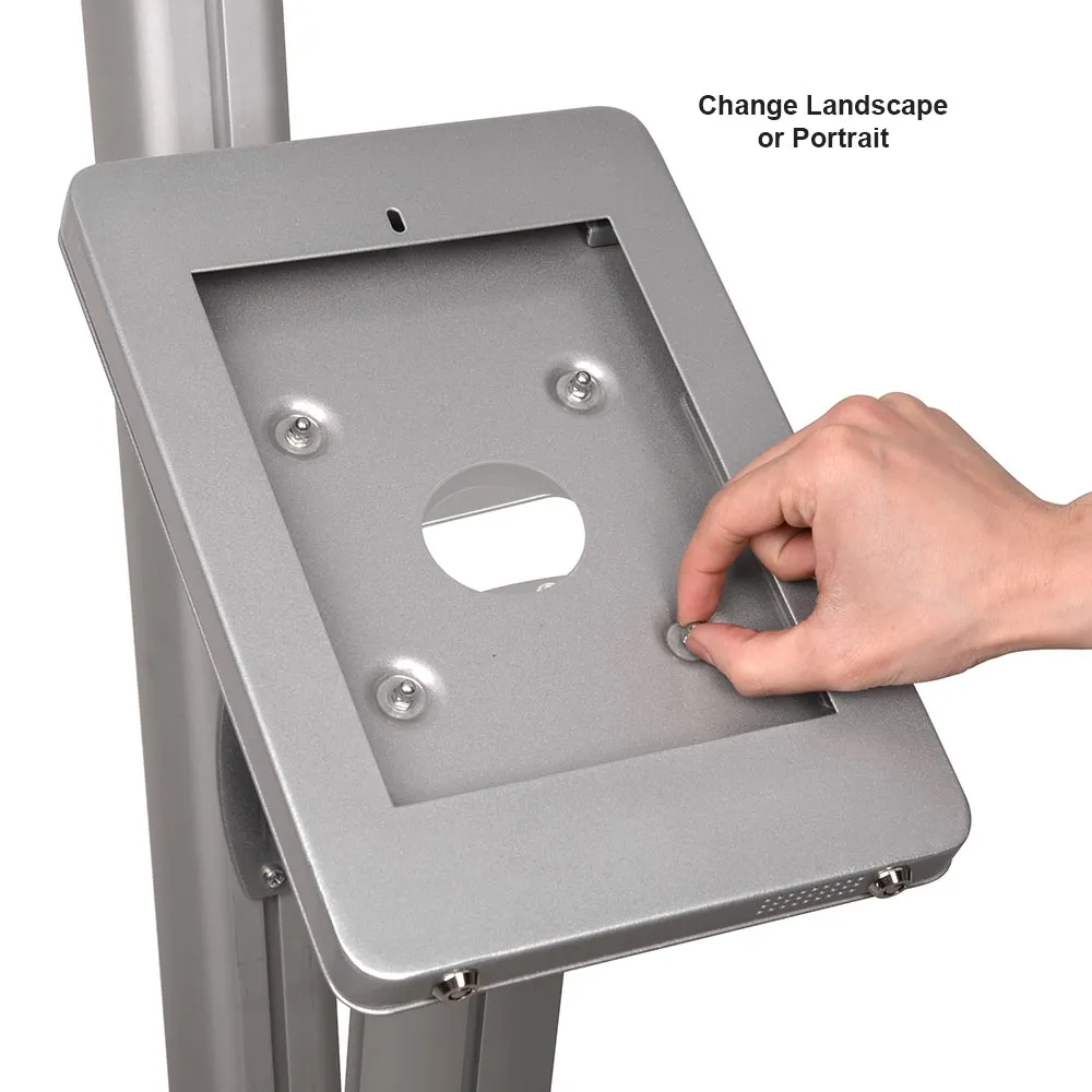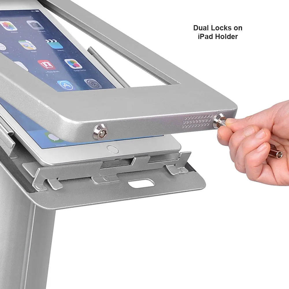 This retail iPad stand has a locking enclosure designed to secure Apple® iPad 7th (2019), 8th (2020), & 9th (2021) generations in either portrait or landscape orientation. The mount is angled to make usage easier no matter what format your place the screen. There are dual locks on the unit to help prevent theft and allow for use in public areas without worry. The metal front face covers the home button as well to prevent full access to the tablet and keep users on the App you have open!