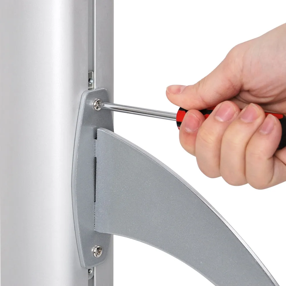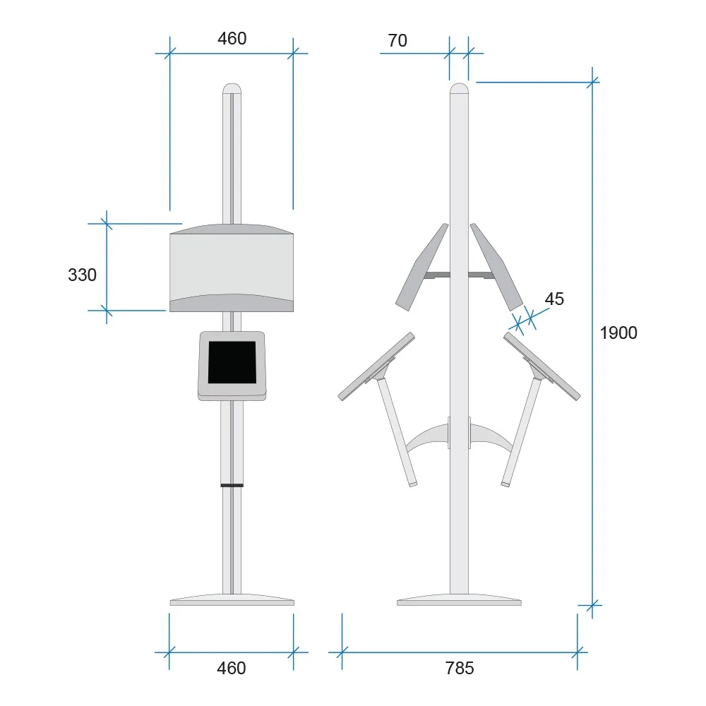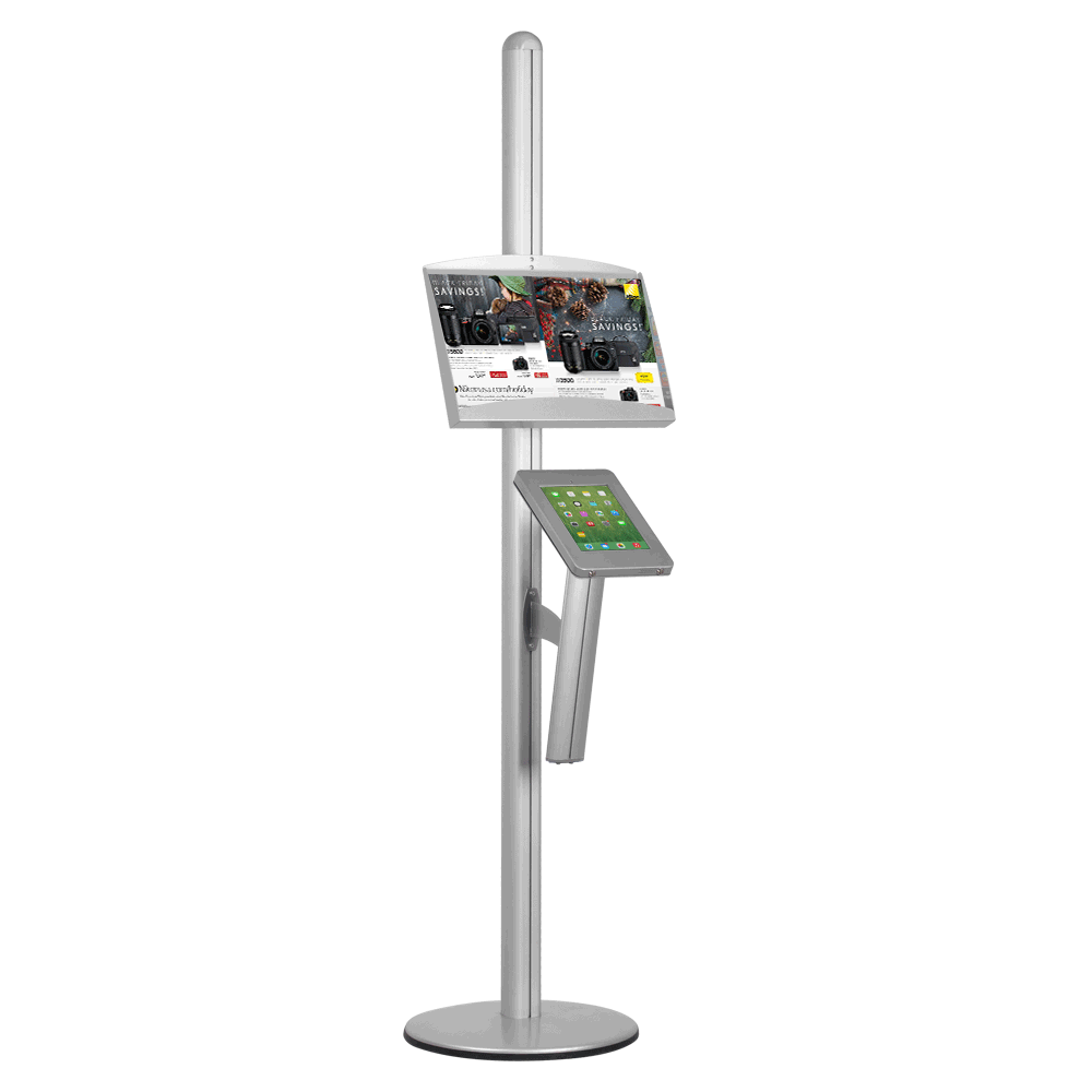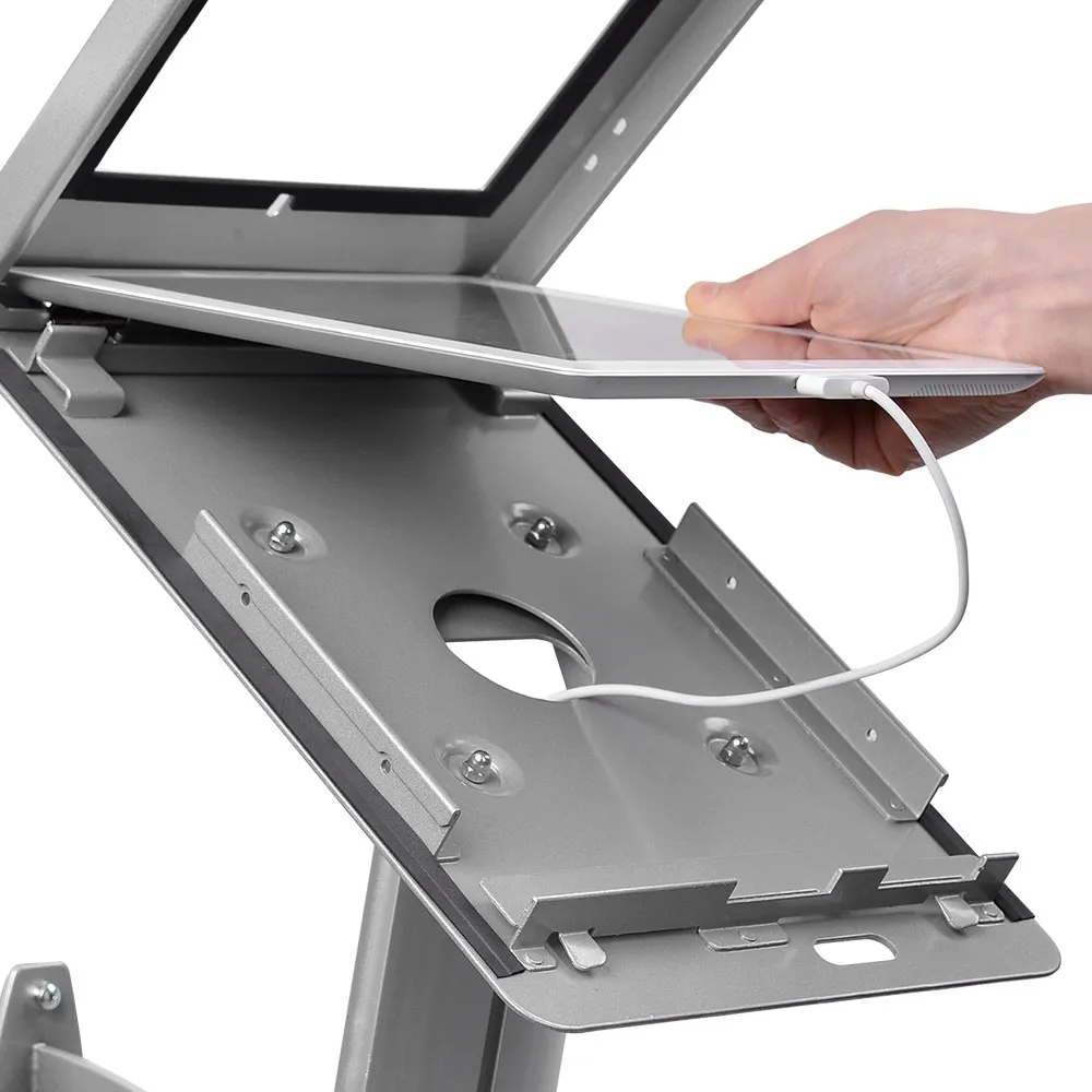 This retail iPad stand, one of many locking tablet displays available, uses a brochure pocket to provide take away information to visitors at shopping centres, universities, trade shows, retail stores, and sporting arenas. The pocket can hold two A4 (210 x 297mm) leaflets side by side or display a A3 (297 x 420mm) pamphlet, providing take away information for customers learn more about your goods and services. The modular display can have the tablet mount or pocket placed at any height along the centre pole, and additional components are available to fully customise the display to meet your needs. You can partly hide power supply cables inside the display to maintain a tidy look that works great at any location including !