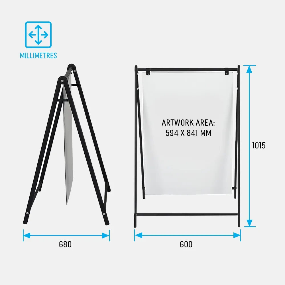 This pavement swinging sign is designed for both indoor and outdoor use, making a great addition to any marketing plan. This display has custom printed graphics on both sides of the hanging sideboard, with the large A1 display allowing for large text and vivid imagery that will surely draw in passersby. A digital printing process is used to ensure true depiction of design with vivid colours that turns heads. This display can be found outside of retail stores, cafes, information centres, exhibition halls, shopping centres, restaurants, transportation hubs, and more.