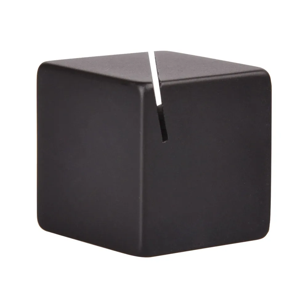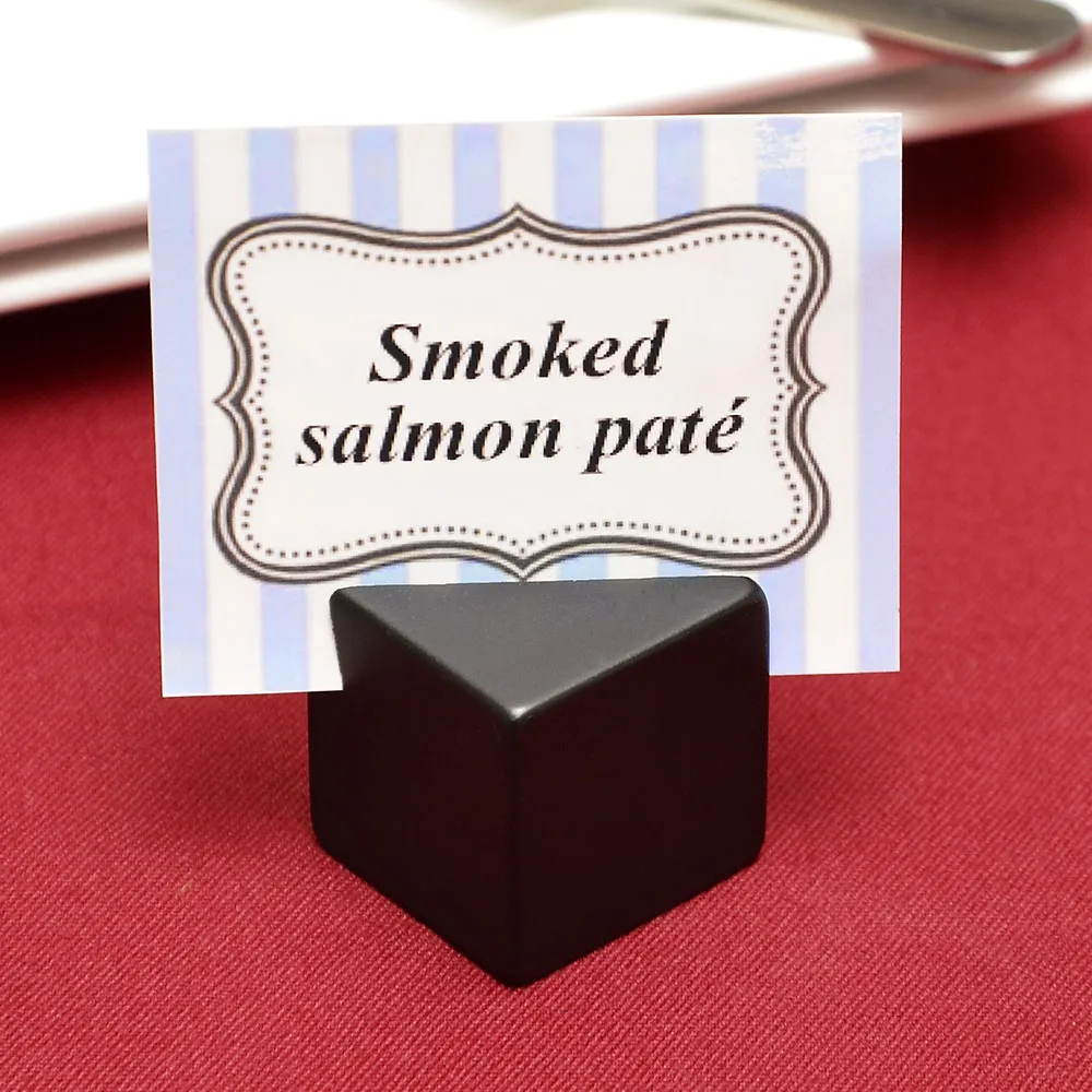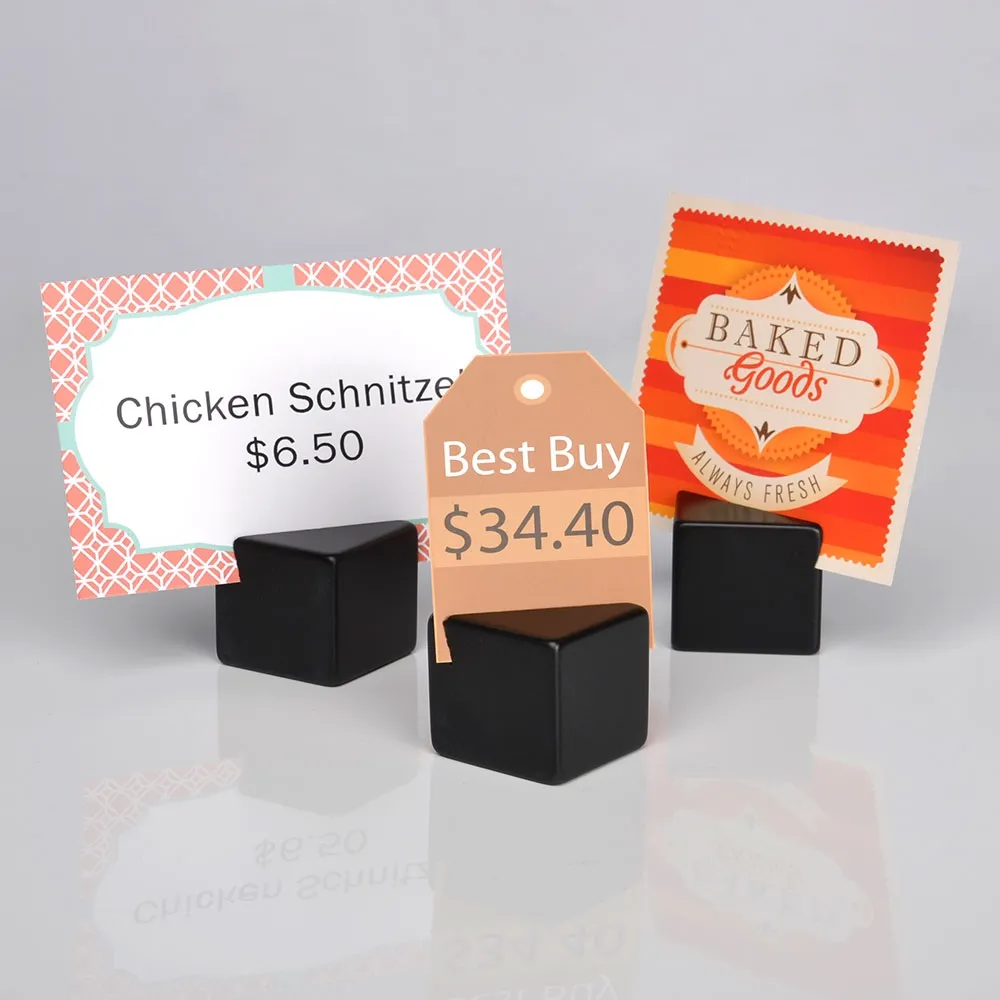 These table card holders, also known as a wedding number stand and acrylic sign display, are an inexpensive display with a sleek look for use in any location. The small cube is a black acrylic block that takes up little space on a table or countertop to leave plenty of room for merchandise or decorations. This durable display is great to buy in bulk to have a standard sign holder at different tables or coutners at your location.