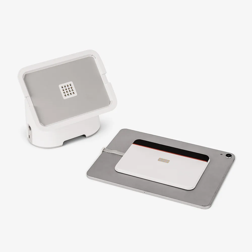 The WisePad 3 countertop kit, built as a commercial-grade payment stand, features a rotating base that enables effortless screen sharing between staff and customers. Hidden cable routing maintains a polished counter aesthetic, while the universal tablet mount holds iPad and Android devices securely without clips or brackets. The reader supports tap-and-go and chip payments, including Apple Pay and Google Pay, making it ideal for cafés, boutiques, and service counters where presentation and efficiency are essential.