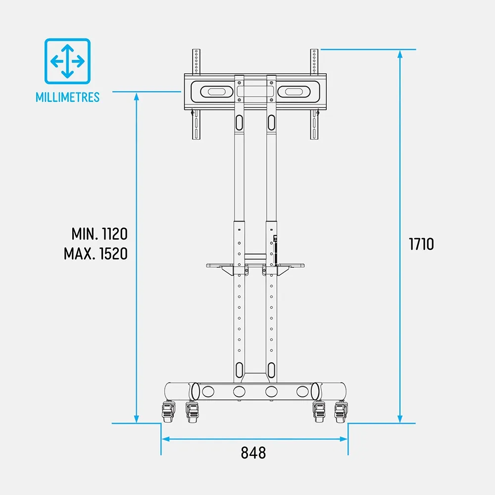 - Entire stand is height adjustable to display screen between 1120 & 1520mm