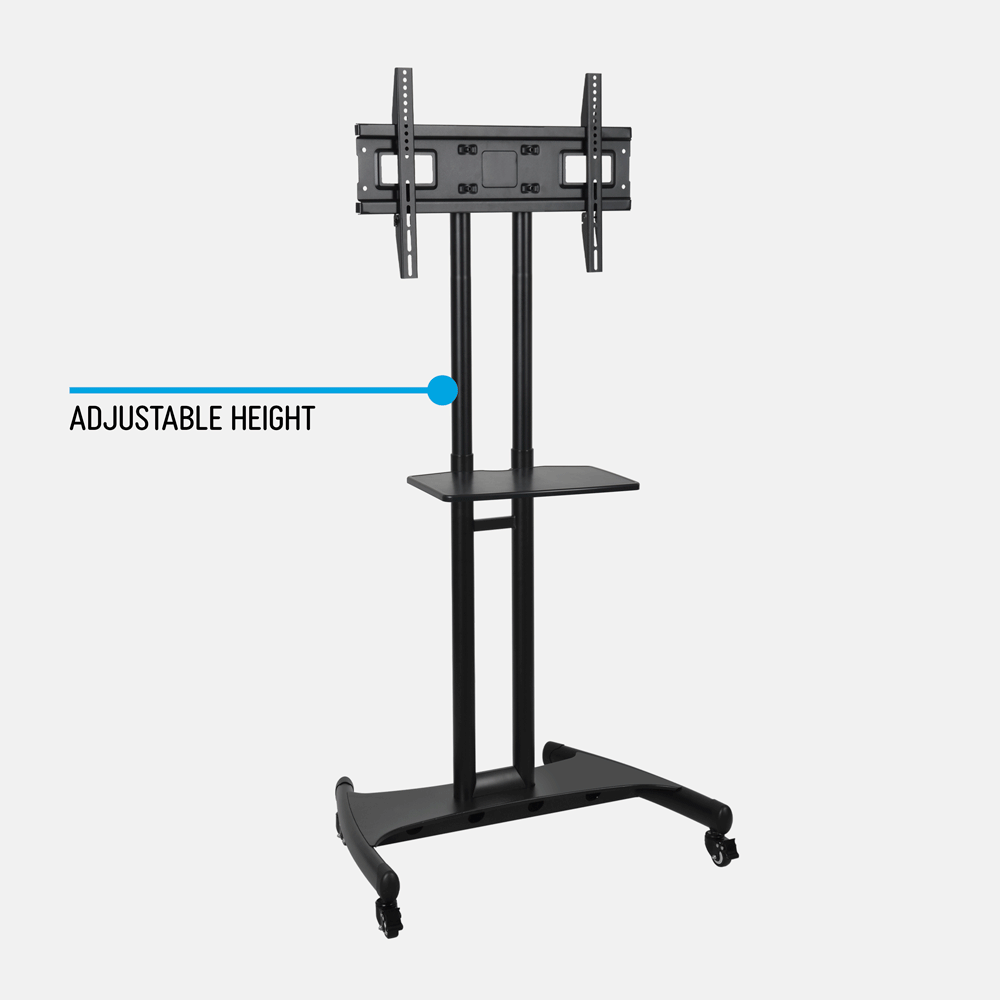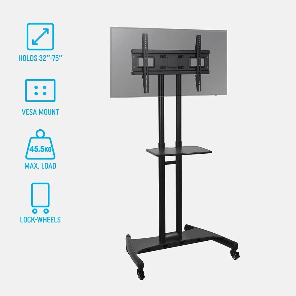 - Mobile TV mount has universal bracket for 32" to 75" flat panel TVs