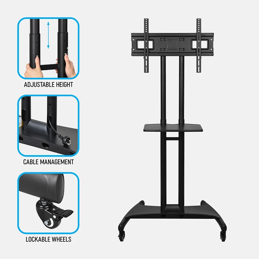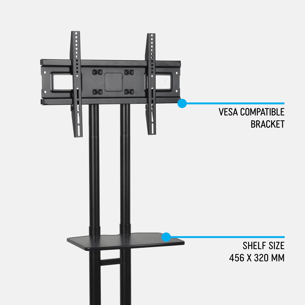This TV stand, mobile TV mount features lockable castors on the bottom of the stand to make movement easy. Each wheel has 360° maneuverability and can lock to make placing it in desired area simple whilst offering stability once in place. There are (2) shelves with this unit as well, with the middle shelf great for peripherals such as laptops, DVD players, streaming devices, and more. Internal cable management helps maintain a tidy, professional look by guiding cables through the stand's centre.