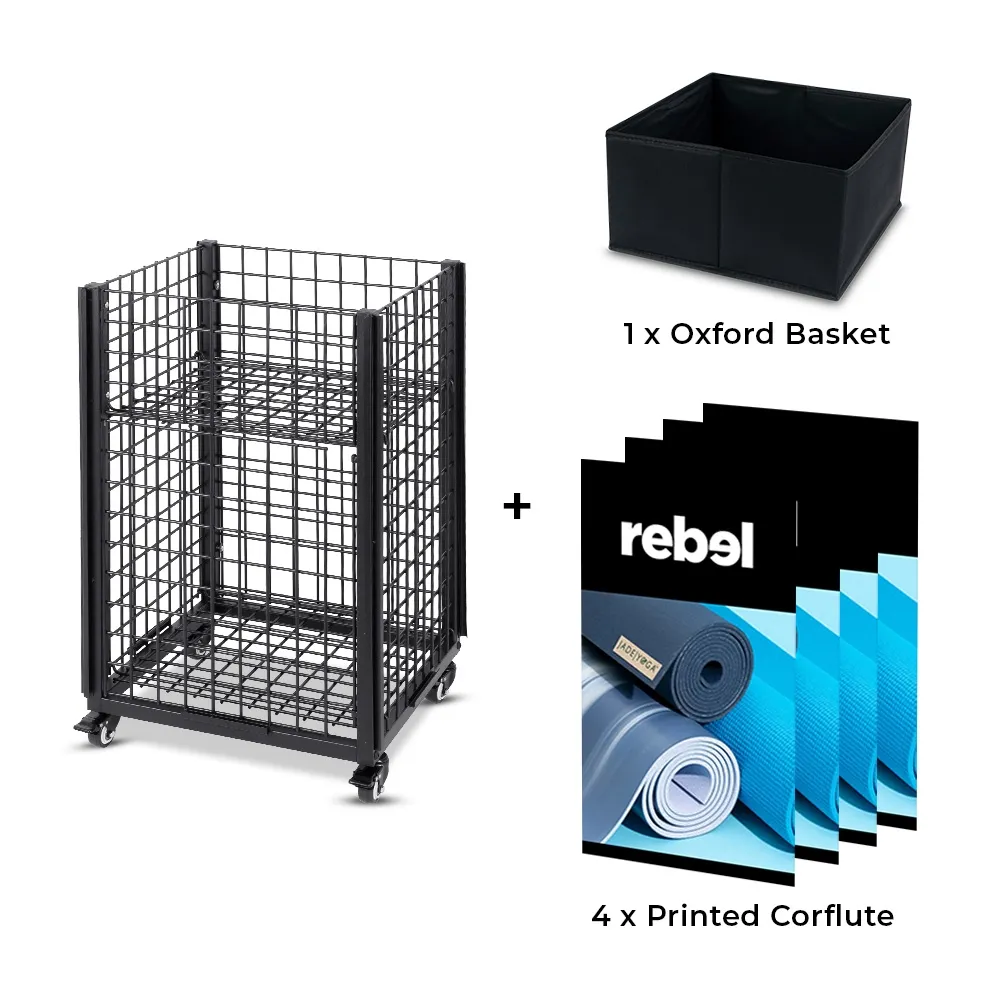 The dump bin basket, like a mobile merchandising stand, combines functionality with professional aesthetics through its wire construction and custom print capabilities. Storage space beneath the main compartment provides additional inventory housing for busy supermarket environments and sports retailers managing multiple product lines. The four 445 x 675mm corflute signs accommodates full-colour custom printing to align with brand guidelines across cosmetics displays and promotional campaigns.