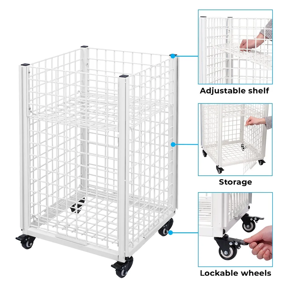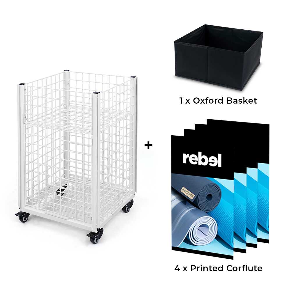 - Dump basket with lockable wheels for secure, mobile merchandising