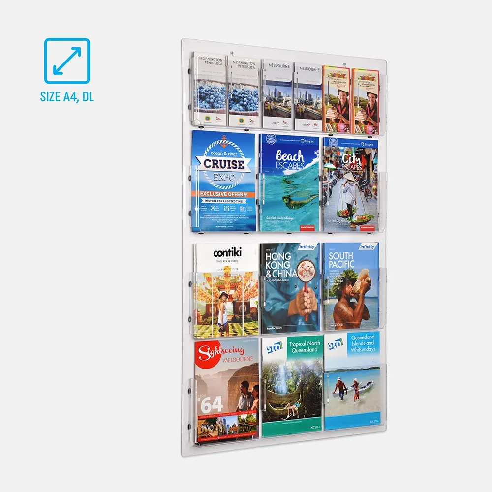This brochure or magazine wall rack has 12 clear acrylic pockets. Each pocket can hold a single A4 (297 x 210mm) brochure or, simply by adding one of the acrylic dividers included with the unit, can be converted to hold 2 x DL flyers side by side. This results in a total capacity of either 12 x A4 or 24 x DL brochures, or any combination between the two.